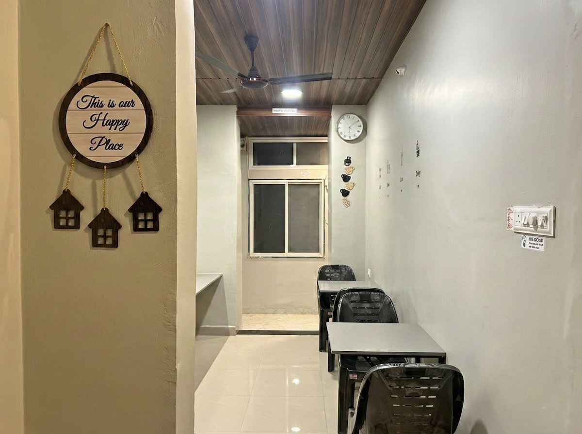 [Note: Male-Only bookings Not Allowed] Peaceful 2BR homestay in Vijay Nagar (Indore), thoughtfully designed for families, couples and groups visiting the city. Set in a secure, family-managed residential property with the hosts living downstairs for added comfort. Enjoy shared kitchen, lounge access, RO drinking water, refrigerator, microwave, and washing machine. Clean, calm surroundings with a warm, homely atmosphere for a comfortable stay. Home-style Vegetarian meals available on request.