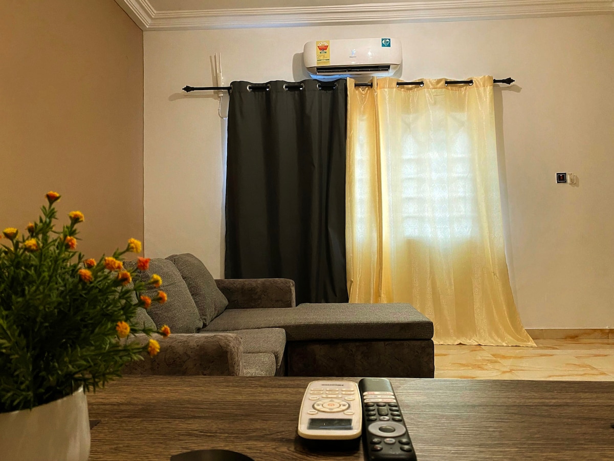 Modern comfort in a stylish, beautifully lit apartment with clean contemporary finish & a warm evening glow that instantly feels upscale & inviting. Located in a quiet neighborhood 19mins from the Airport, 17 from accra mall,10mins from Atlantic Mall, and about 30 mins from the Aburi Mountains, offering easy access to shops, business hubs & leisure centers ..You’re never far away from everything you need yet still tucked away enough to relax & unwind. A chic retreat you’ll love coming home to.