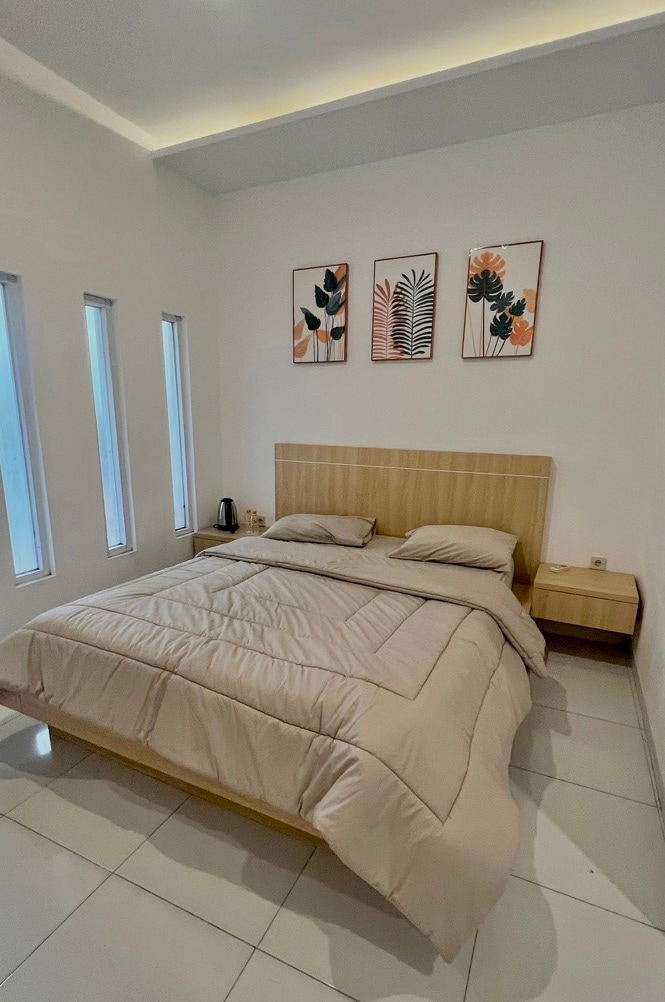 Villa Jogja con piscina privada y totalmente amueblada Ubicación estratégica, hogareño, limpio, fresco, cerca de la carretera principal y cafetería amplia zona de aparcamiento (Pajero, Fortuner, Innova) Especificación: - Dormitorio 1 - Baño 1 - Minipiscina privada. - Cocina - Aire acondicionado - Electricidad 2200 vatios - Armario + Ducha - calentador de agua - Seguridad - Televisor inteligente de 43 pulgadas - cama tamaño king (180X200) - Wi-Fi. - mesa, silla, armario Día laborable: 350 000/día Fin de semana: 500 000/día ¡¡¡STOK TERBATAS !!! HARUS BOOKING TERLEBIH DAHULU