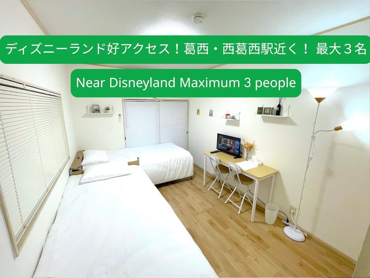 Somos anfitriones de Airbnb desde 2016 en las cercanías. Creo que somos los anfitriones más antiguos de esta zona. Ahora también tenemos otros 6 Airbnb. 1 dormitorio/cocina/inodoro/baño/capacidad para 4 personas Recomiendo hasta 3 personas. 4 personas puede ser pequeño (por lo que la tarifa adicional es más barata) 1 cama de matrimonio, 2 futones individuales. A 15 minutos de Disney en autobús local directo. A 30 segundos a pie de la parada de autobús más cercana. A 15 minutos a pie de la estación de tren más cercana. A 1 minuto a pie de una tienda de comestibles (abierta las 24 horas). A 5 minutos a pie del supermercado, la farmacia y el restaurante japonés.