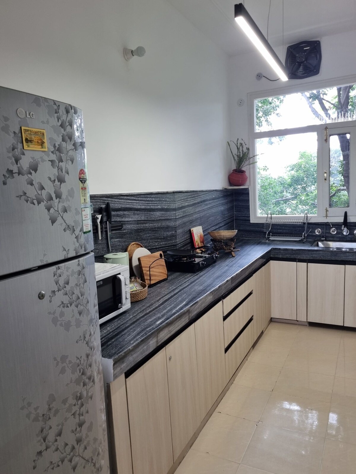 • Apartamento recién construido, totalmente privado en el primer piso • 3 dormitorios tamaño king, 2 baños, gran sala de estar y balcón con vistas verdes • Cocina modular, placa de inducción, agua RO y utensilios de cocina básicos. Swiggy/Zomato/Instamart/Blinkit disponibles • Aire acondicionado dividido, calefacción opcional, paneles de pared LED y noches de karaoke opcionales • Ubicación privilegiada en el centro de la ciudad: cerca del Templo Dorado, tiendas y restaurantes locales • Ambiente residencial tranquilo y silencioso, ideal para familias y grupos • Orientación local personalizada del anfitrión y comodidad premium