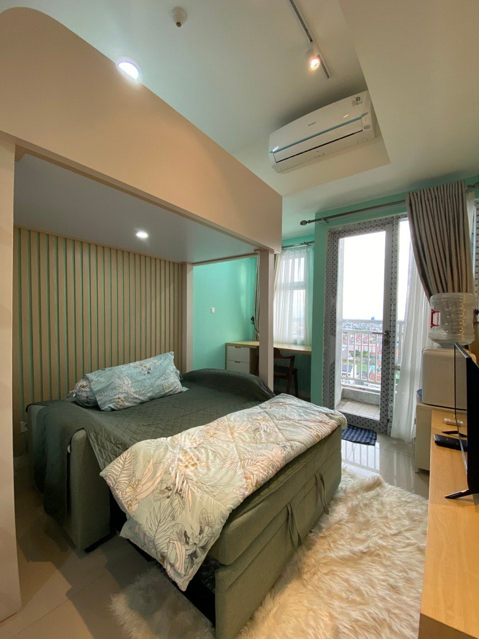 Un apartamento espacioso y elegante de 34 m² con 1 cama king size (180 x 200), 1 cama individual (100 x 200) y un sofá cama con capacidad para una familia o un grupo de 4 a 5 personas. Ubicada en el piso 37, esta unidad tiene vista directa a la piscina y una excelente vista a la hermosa ciudad de Makassar. El edificio de apartamentos cuenta con seguridad las 24 horas, una zona común, un gimnasio y varias piscinas. Relájate, relájate y disfruta de tu estadía.