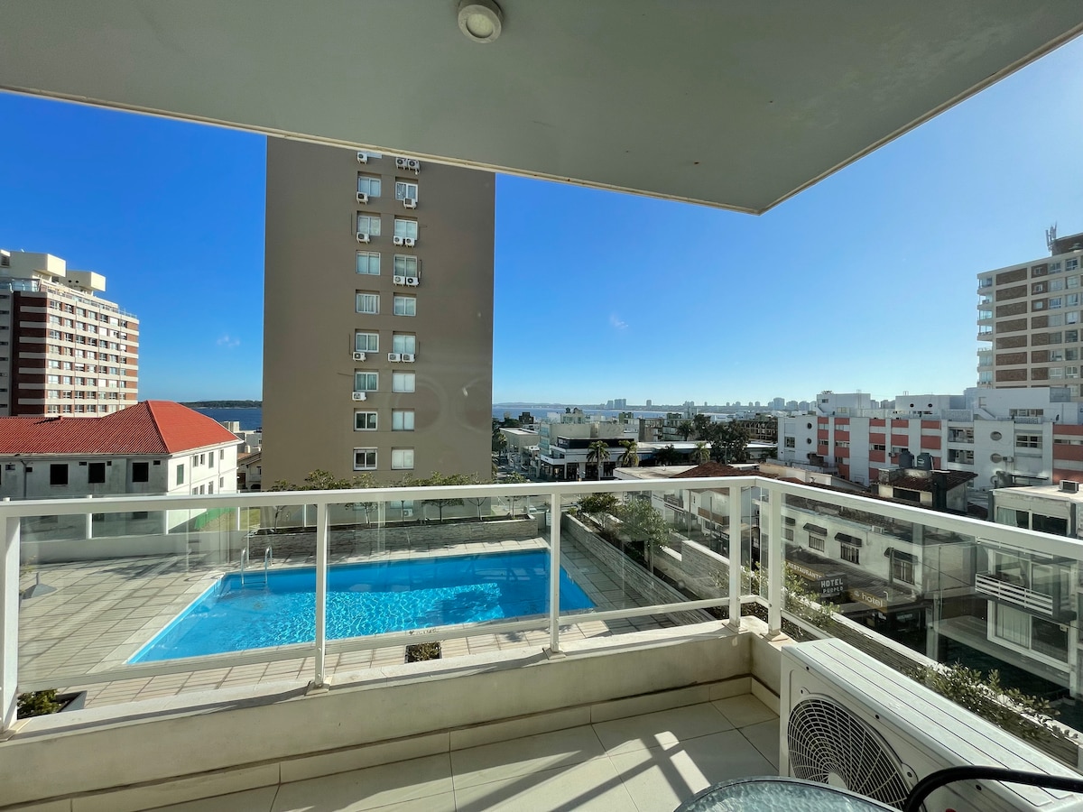 Moderno, luminoso y renovado apartamento céntrico sobre Avenida Gorlero. Tiene una hermosa vista desde el balcón con hermosos atardeceres. A 2-5 cuadras de distancia hay supermercados, tiendas, bares, restaurantes, el puerto y ambas playas (Mansa y Brava). Tiene seguridad y recepción 24hs, estacionamiento cubierto, servicio de mucama, lavandería, pequeño gimnasio, y sala de juegos. Durante las fiestas, cinco noches de mínima estadía.
