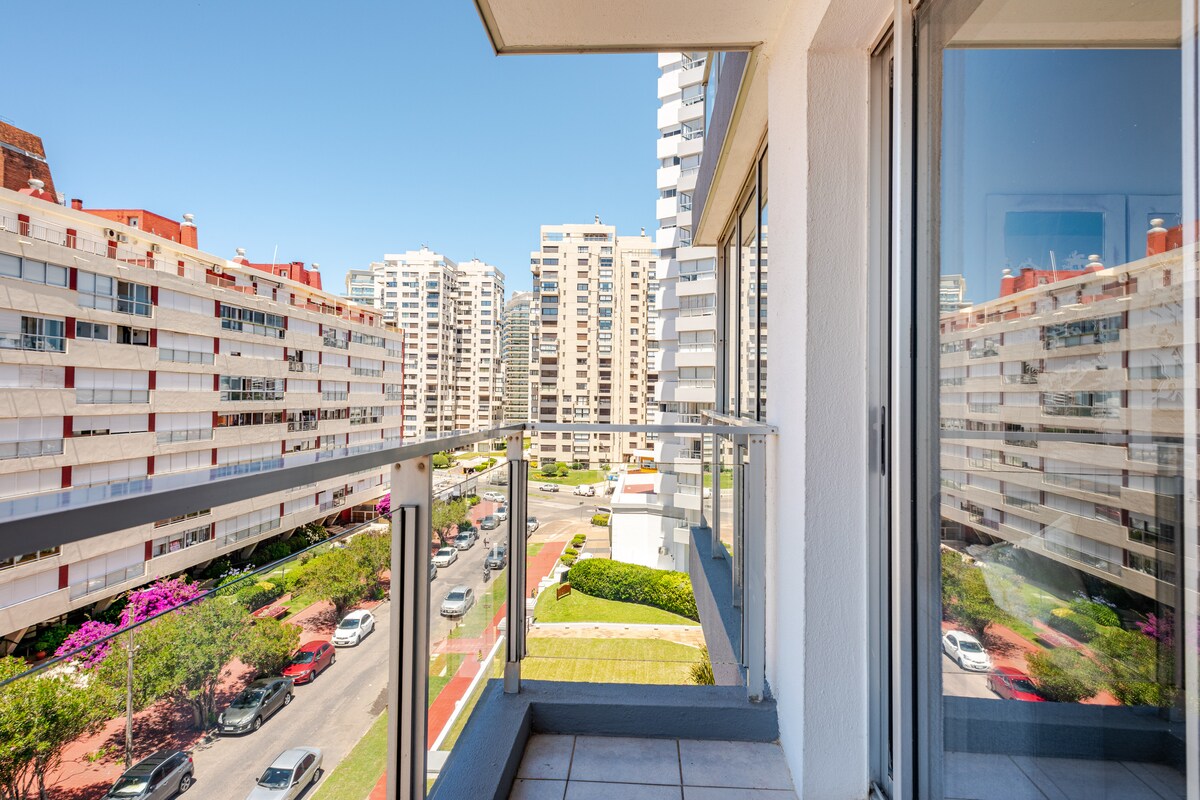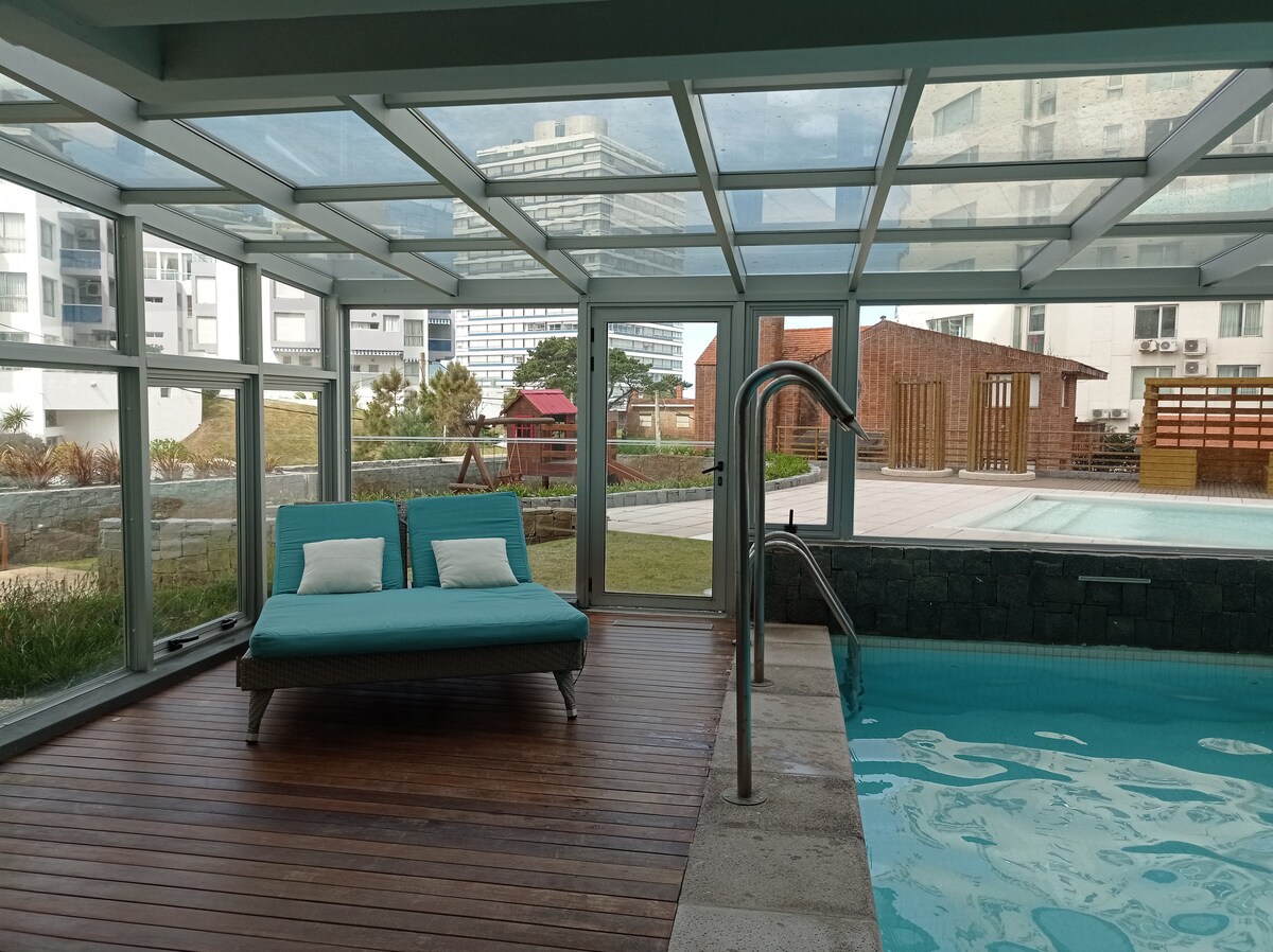 Apartamento de un dormitorio a metros de Playa Mansa y frente al Hotel Enjoy. Muy luminoso, con linda vista a la Playa mansa y todas las comodidades. Wifi , TV Cable, Servicio de mucama diario. Garage propio y lavadero. Muy lindo decorado y completamente equipado. TVs y aire acondicionado en los 2 ambientes. El edificio tiene seguridad 24 hs y cuenta con amenities de calidad: piscina exterior climatizada, gimnasio, sauna, barbacoa con amplia terraza con vistas a la Bahia. Próximo a Gorlero