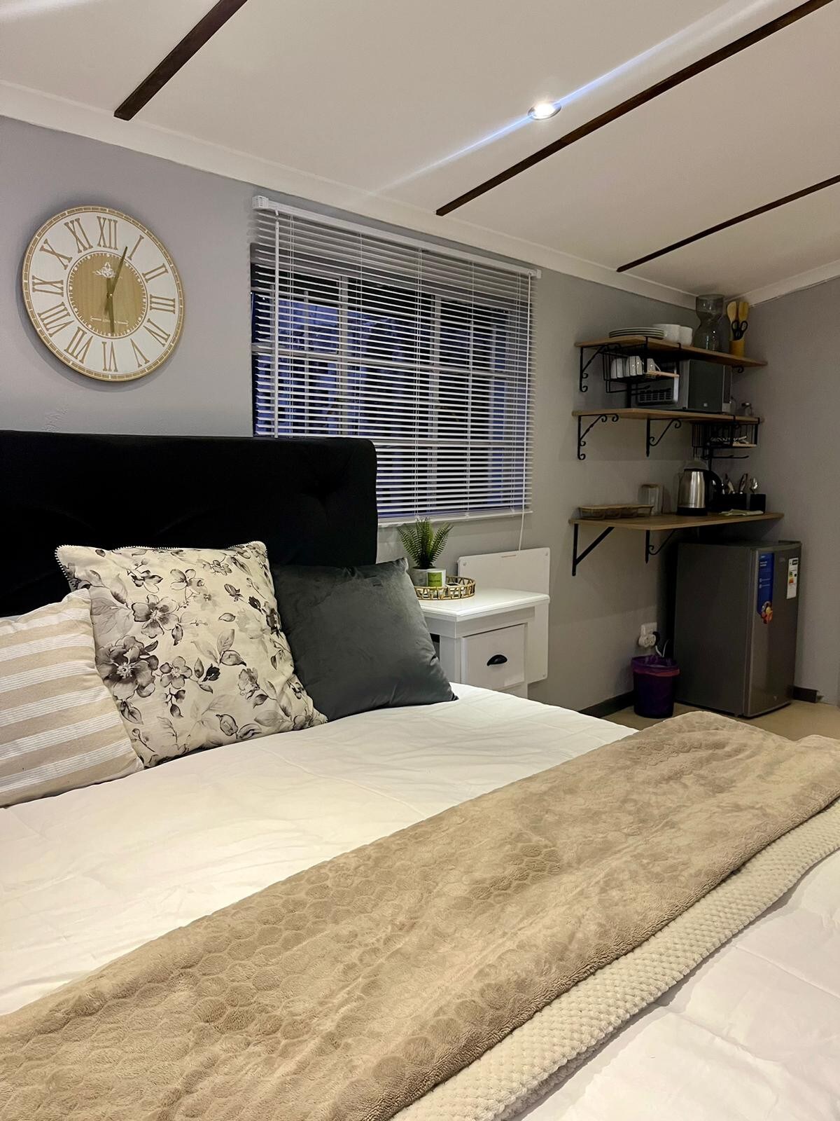 Modern 4-Star [studio style] guest house for two adults. Ideal for traveling couples, stop-overs, reps and working professionals. 2min walk from famous coffee shop and restaurant, Hagenhuis. The unit is private. Queen size bed, WiFi, Smart TV, Kitchenette with kettle, fridge and microwave...and complimentary rusks.