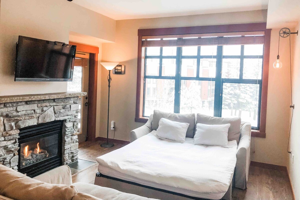 Cozy 4-star Monache hotel/condo studio privately owned with amazing views from the 5th floor of the mountains and the Village/Gondola. 1 King Bed & Queen Fold out Sofa (perfect for kids). 2-minute walk to the Village & Gondola, as well as bars, shops, restaurants! Guests enjoy access to amazing amenities including: - Heated pool & jacuzzies - Private heated garage parking - A/C & Heat - Gym - Laundry - Restaurant/Bar/Coffee Shop New Luxury Bedding, Down Pillows & 2 Robes for absolute comfort.