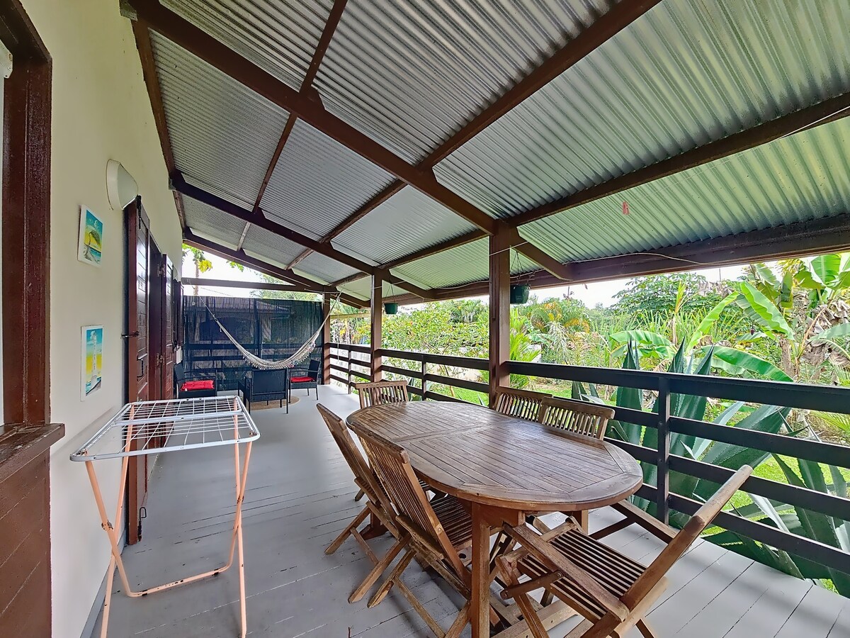 Carbet en medio de un gran jardín arbolado, a orillas de la cala y a pocos metros del río Mana. Ideal para la pesca, la relajación, la tranquilidad y los amantes de las plantas y la naturaleza. Bonitos paseos en los alrededores. Canoa disponible para pasear o pescar por el río.
