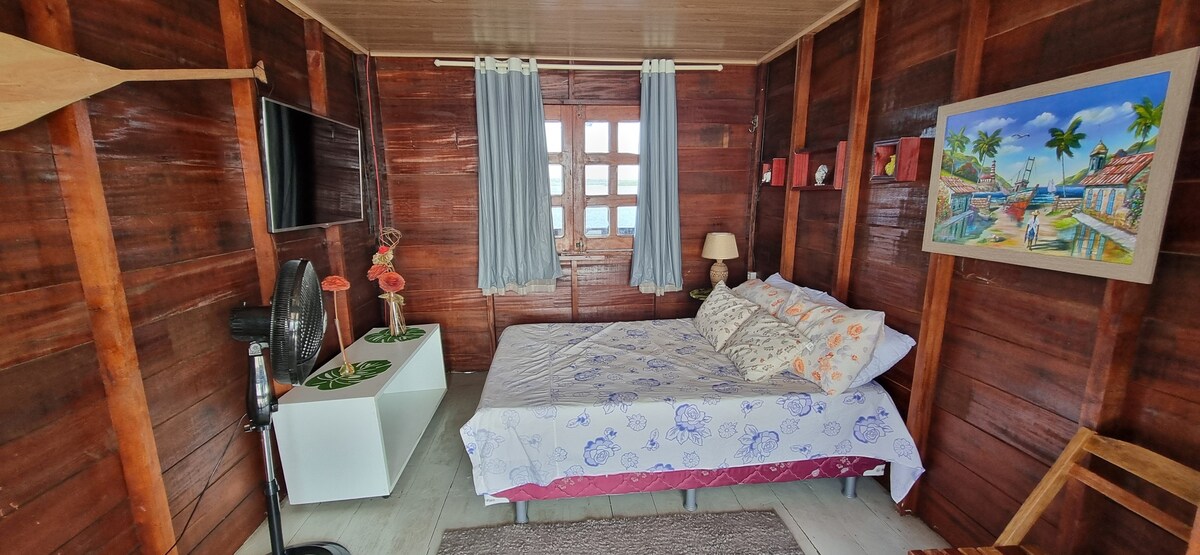 Este lugar es la definición de único y exclusivo. Perfecto para parejas que buscan paz y tranquilidad o incluso familias pequeñas. Nuestra propiedad se encuentra en el corazón del Amazonas, en el lago Tarumã con una vista espectacular de la puesta de sol y también de la salida de la luna, dos espectáculos de naturaleza memorables, todo desde la terraza de nuestra casa flotante. Tenemos una acogedora suite con una cama doble y una gran decoración. Cuenta con barbacoa de gas, cocina 100% equipada y ducha exterior.