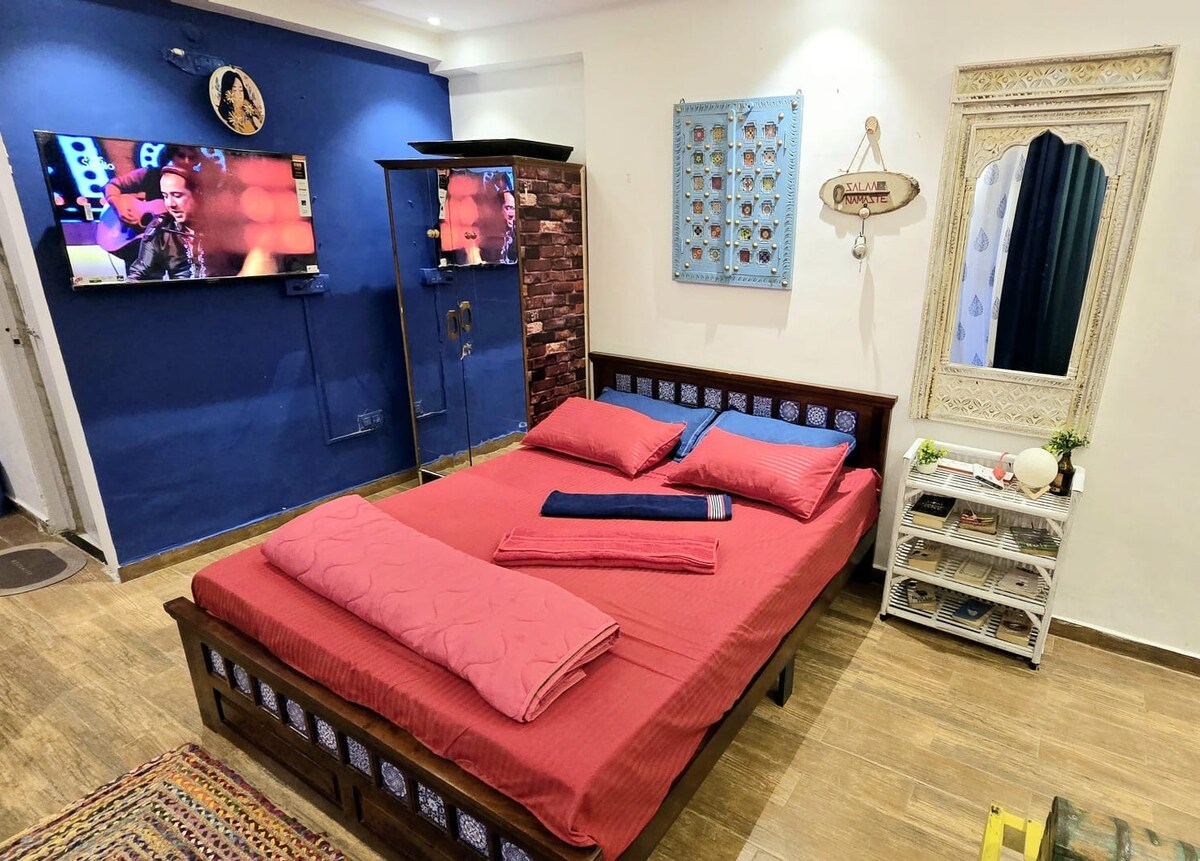 Este lugar es uno de los únicos con vistas al mar de estilo griego, 1 dormitorio con balcón. Los huéspedes pueden ver las olas del sereno mar Arábigo desde la habitación y el balcón. Tiene un ambiente impresionante, que creamos con arte de pared de estilo griego hecho a mano en la habitación y el patio. Seguramente te hipnotizará mientras tomas té o bebidas. Está en la playa de Anjuna, en el norte de Goa, con hermosos atardeceres como Purple Martini, Mayan Beach Club, Eva Cafe, Guru Cafe, Slow Tide, etc., y restaurantes, chiringuitos, mercadillo a poca distancia a pie.