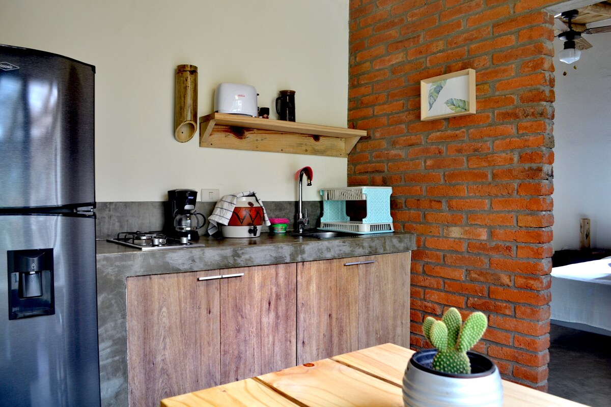 Suite en Puerto Rico (a 5 minutos de Ayampe)** con cocina, dormitorio, baño y terraza privados. Disponemos generador eléctrico. La suite incluye aire acondicionado, agua caliente y WiFi (400Mbps). Estamos a solo 7 minutos de la playa. También contamos con un área común de parrilla y un espacio multiusos para yoga, coworking, ping pong y más. Pregunta por nuestra política pet-friendly. Solo para adultos—no se permiten menores de edad ni bebés