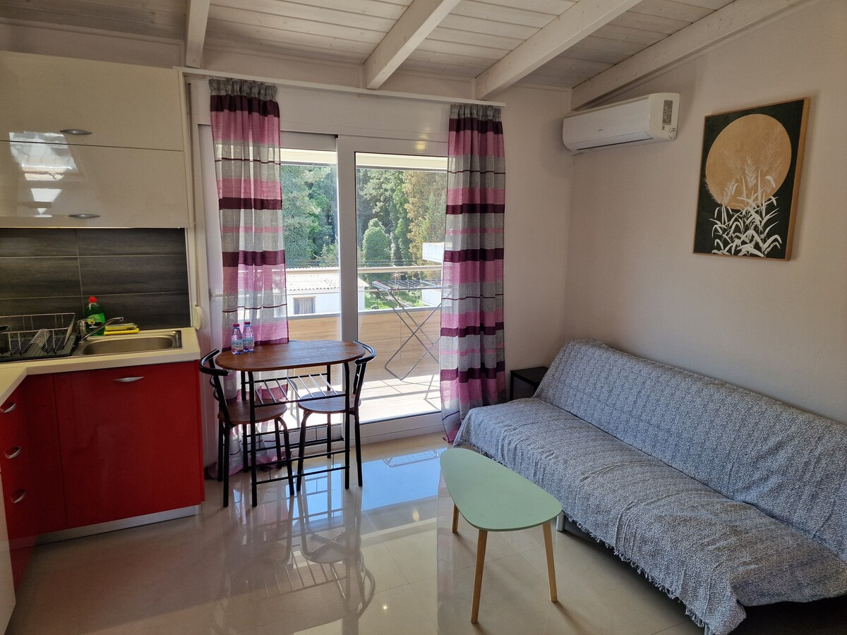 Καλαίσθητο στούντιο(16,65 τετραγωνικων) με μεγάλη βεράντα ,πολύ κοντά στο κέντρο της πόλης.Θέα σε πλατεία ,δίπλα απο τη στάση λεωφορείου ,super market και ξυλόφουρνο . 10 λεπτά με τα πόδια το κέντρο της πόλης και 15 λεπτά επίσης περπατώντας ,το ιστορικό κέντρο ! 5 λεπτά με τα πόδια η λίμνη των Ιωαννίνων!Πλήρως εξοπλισμένη κουζίνα,καφετιέρα και dvd player με ταινίες για σινεφίλ