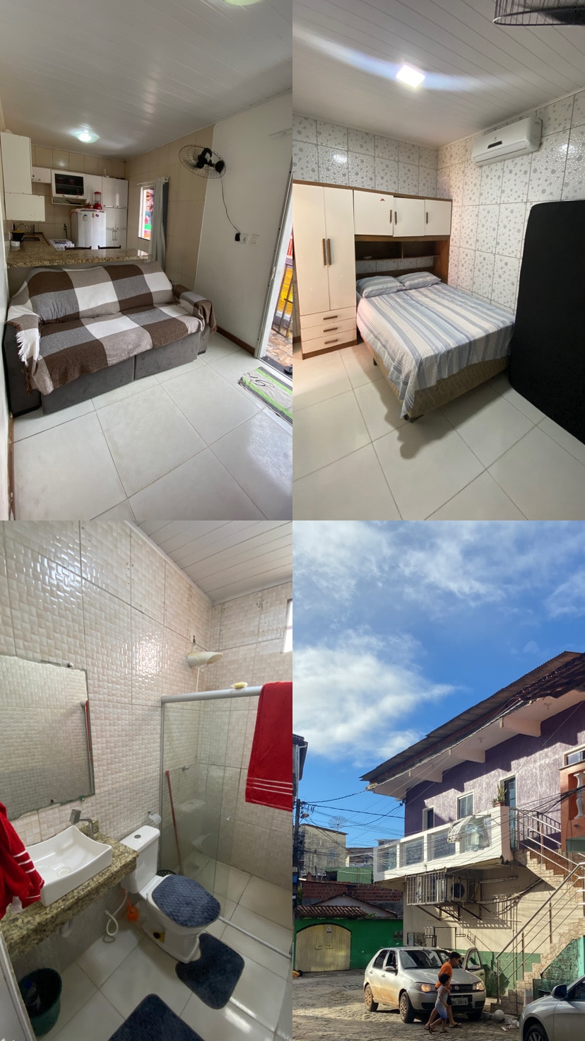 El departamento Concha se encuentra en una ubicación privilegiada de Itacaré, a solo 5 minutos de las principales playas de la ciudad. En carril pavimentado, señalizado y para bicicletas. El apartamento tiene 1 suite con cama doble y aire acondicionado, además de una habitación en la que la configuración puede ser una cama doble o dos camas individuales. Cocina equipada con nevera, estufa, microodas, sandwichera,platos y cubiertos, todo para que puedas preparar tus comidas. Sala con TV y WiFi. Para un máximo de 6 personas.
