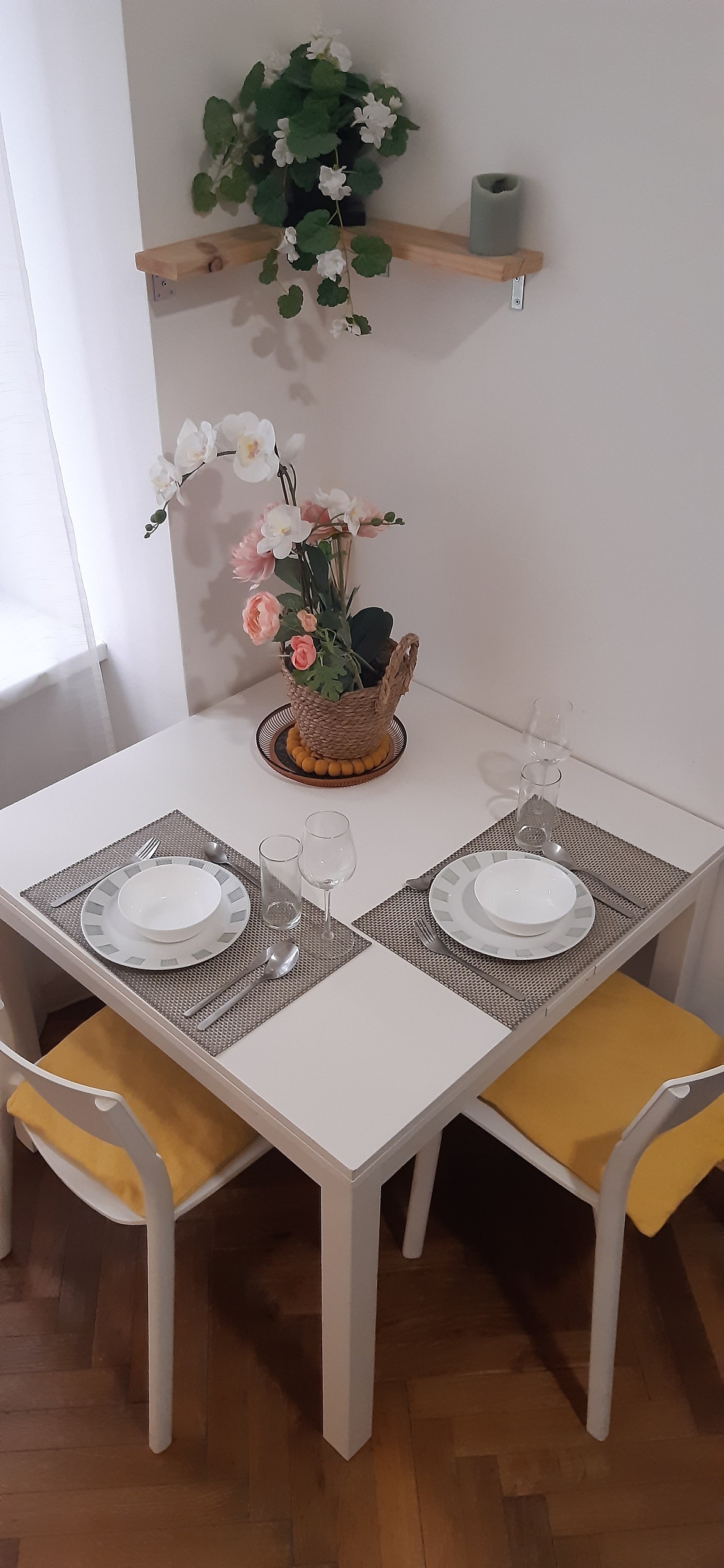 Patio lateral, el apartamento es extremadamente tranquilo y libre de ruido de tráfico. El contorno, el piso, los azulejos y gran parte del mobiliario son el producto de un proyecto de amor de tres años. El enorme suelo de madera de abedul da una sensación de conexión, su tratamiento de teñido blanco y jabón hacen que caminar sobre él sea suave y relajante y las habitaciones luminosas. Los azulejos art nouveau azul claro y blanco en el baño combinados con la fuerte ducha de mosaico rojo impresionan una sensación de amanecer en el día a día.