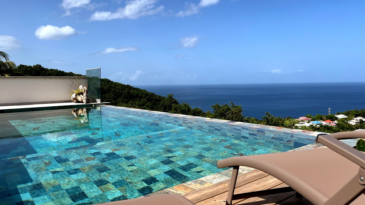 Ubicada en un mirador natural con vistas al mar Caribe, la villa 'Blue Star', clasificada de 5 estrellas, es una de las cuatro villas excepcionales que ofrece. *Blue Haven Villas Guadalupe* Capacidad 6 personas, 3 dormitorios con aire acondicionado / 2 baños - Piscina climatizada * y piscina panorámica de coctelería. - mosquiteros en todas las ventanas. - Ducha al aire libre. - vista y acceso directo a uno de los sitios de esnórquel más hermosos. - Equipo de esnórquel - terrenos privados y estacionamiento. - Barbacoa, wifi. - cisterna de agua potable en caso de apagón.