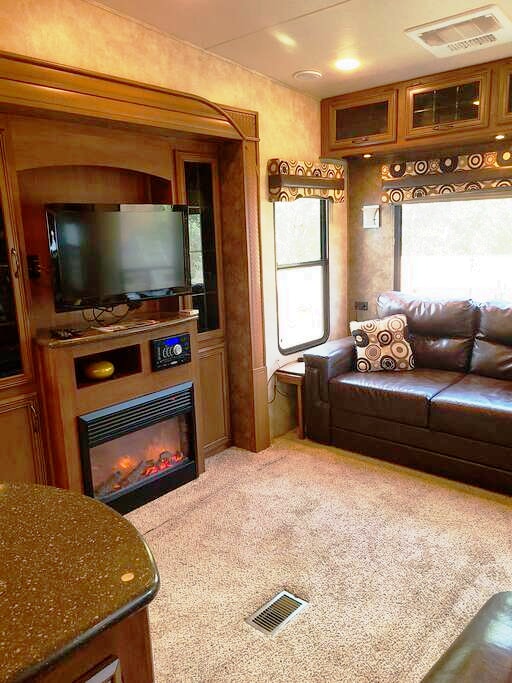 Casa rodante de quinta rueda .;) Para empezar, tenemos gatos que te recibirán. Les encanta la atención. Este Airbnb no es una buena opción si no te ENCANTAN LOS GATOS. Tiene una cama tamaño king y un sofá cama. La cocina tiene todo lo esencial y el baño está incluido. La sala de estar tiene una chimenea eléctrica. Hay televisión tanto en la sala de estar como en el dormitorio y en el exterior con palo de fuego El JACUZZI con rana toro es increíble. Esta primavera daremos la bienvenida a nuestros nuevos patos , pollos y lechones.