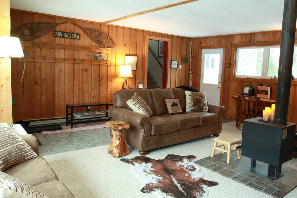 ¡Cabaña familiar durante todo el año a pocos pasos de todos los deportes acuáticos Big Shag Lake y senderos cercanos! A 20 minutos del aeropuerto KI Sawyer, a 35 minutos de Marquette, a 1 hora de Munising. Disfruta de la natación y la pesca en Big Shag, junto con todos los deportes de invierno disponibles en las cercanías. ¡Trae tu barco y amárralo en el muelle! Lanzamiento público disponible. Se esperan reuniones respetuosas (vecinos increíbles al lado). Muelle, fogata, 2 kayaks, sauna de madera independiente, 2 chalecos salvavidas S/2L, 2 flotadores de natación, divertido bar/parrillas.