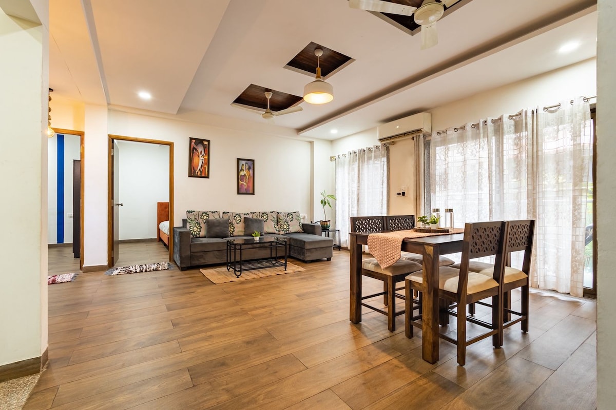 Certificado por Goa Tourism Apartamento con aire acondicionado de 950 pies cuadrados: 2 dormitorios, 2 baños, TV/sala de estar, cocina abierta; lavandería + Espacio de 500 pies cuadrados sin aire acondicionado: comedor para 4 personas; solárium; patio sombreado; balcón al aire libre. Internet de 300 mbps; 4-5 horas de energía de respaldo; Smart TV de 50"; libros; juegos de mesa; estación de trabajo y aparcamiento cubierto Ubicado en Porvorim: 15 minutos de Panaji/Mapusa; 25 minutos de Calangute/Baga; 30 minutos de Anjuna/Vagator; 45-60 minutos Ashvem/Mandrem/Arambol; 60-75 minutos en las playas del sur de Goa; 120 minutos de Palolem