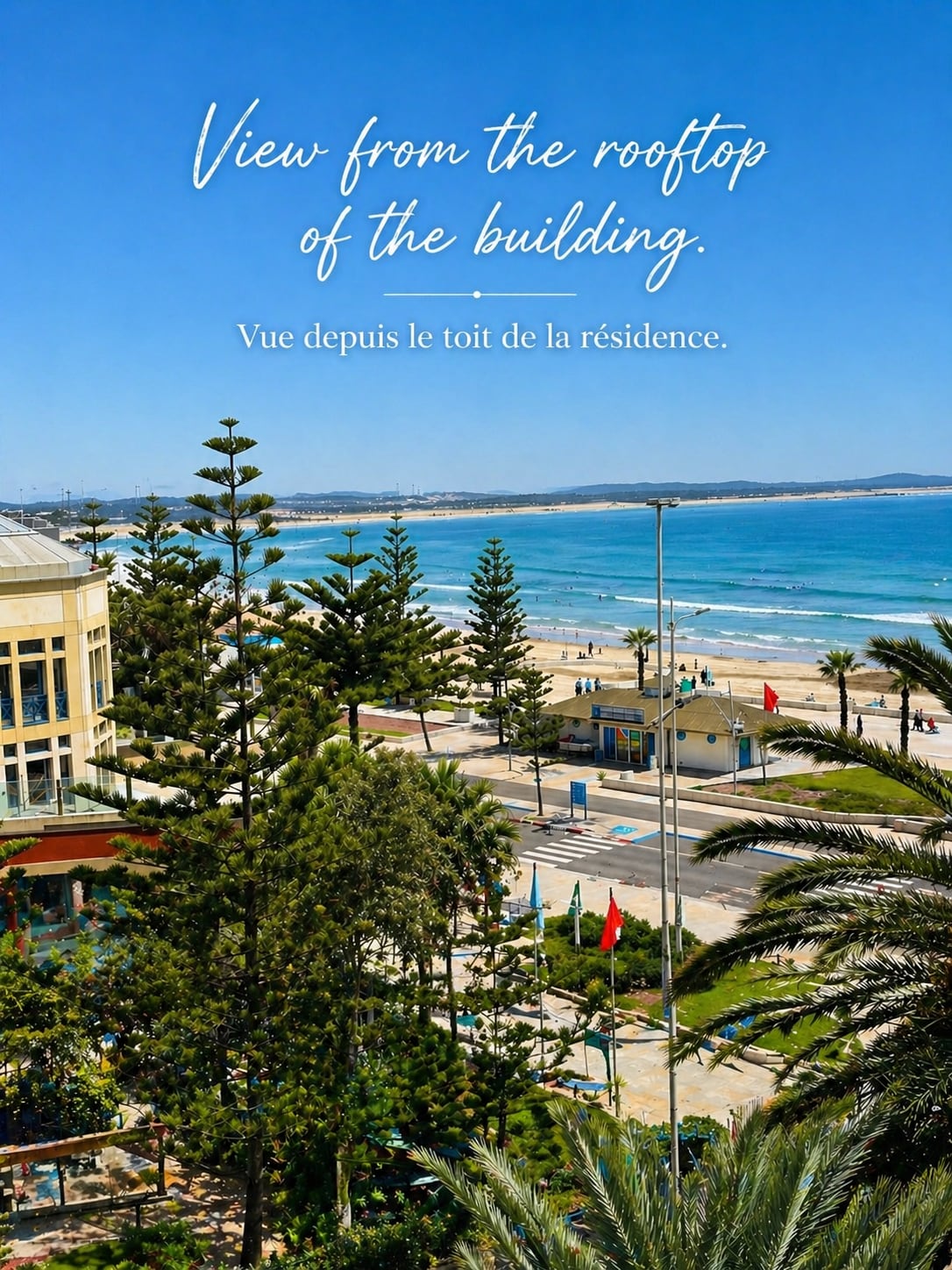 Apartamento atípico con magníficas vistas a la playa de Esauira. Desde su terraza, disfrutará de una de las vistas más hermosas de Esauira, su playa, la isla y la extensión del cielo azul y el océano. Una vista despejada de 360° de toda la ciudad te hará viajar a través de las murallas, las gaviotas y el bosque de Esauira. Está a 50 metros de la arena fina y el mar y a 800 metros de la medina de Esauira, declarada Patrimonio de la Humanidad por la UNESCO.