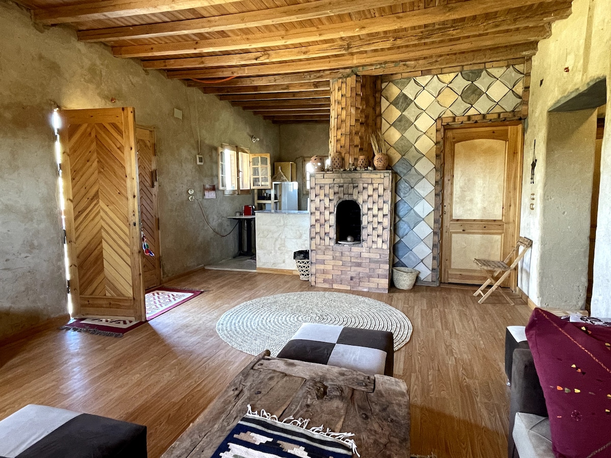 Casa natural tradicional construida por beduinos, en una granja en funcionamiento, huerto de dátiles, piscina de inmersión de manantial de agua dulce. 2 dormitorios, sala de estar, baño completo, cocina, terraza envolvente. Disfruta del entorno natural del desierto negro y de la increíble Vía Láctea en el cielo nocturno. Crea recuerdos en este lugar único y familiar. Ofrecemos comidas y bebidas todo incluido por 25 €/persona al día. Comida beduina fresca y orgánica cultivada, criada y preparada tradicionalmente por nuestro personal las 24 horas en el lugar.