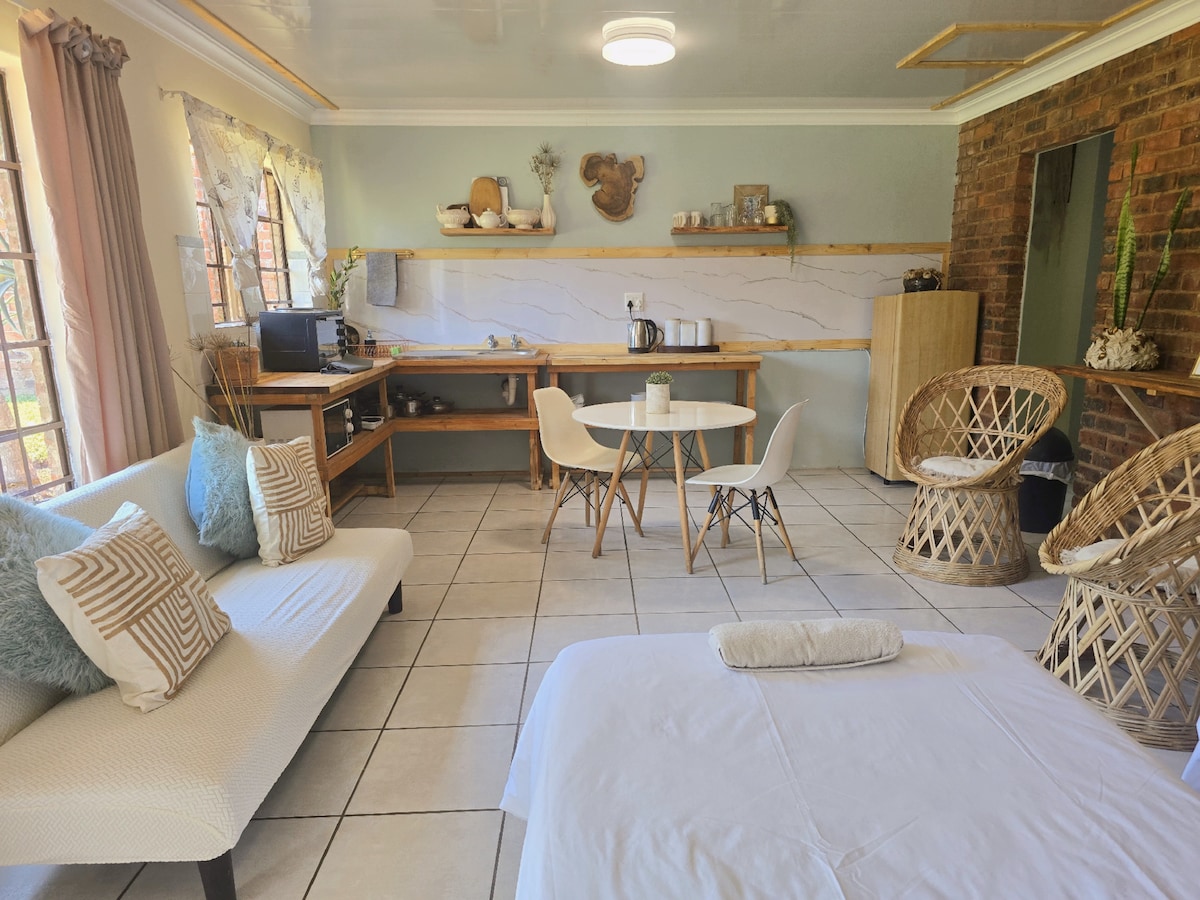 This rondavel is furnished with a queen-size bed and features an en-suite bathroom. The unit offers air-conditioning, a TV with Netflix, a desk, a bar fridge, tea/coffee facilities, a microwave, free Wi-Fi access, and a patio.