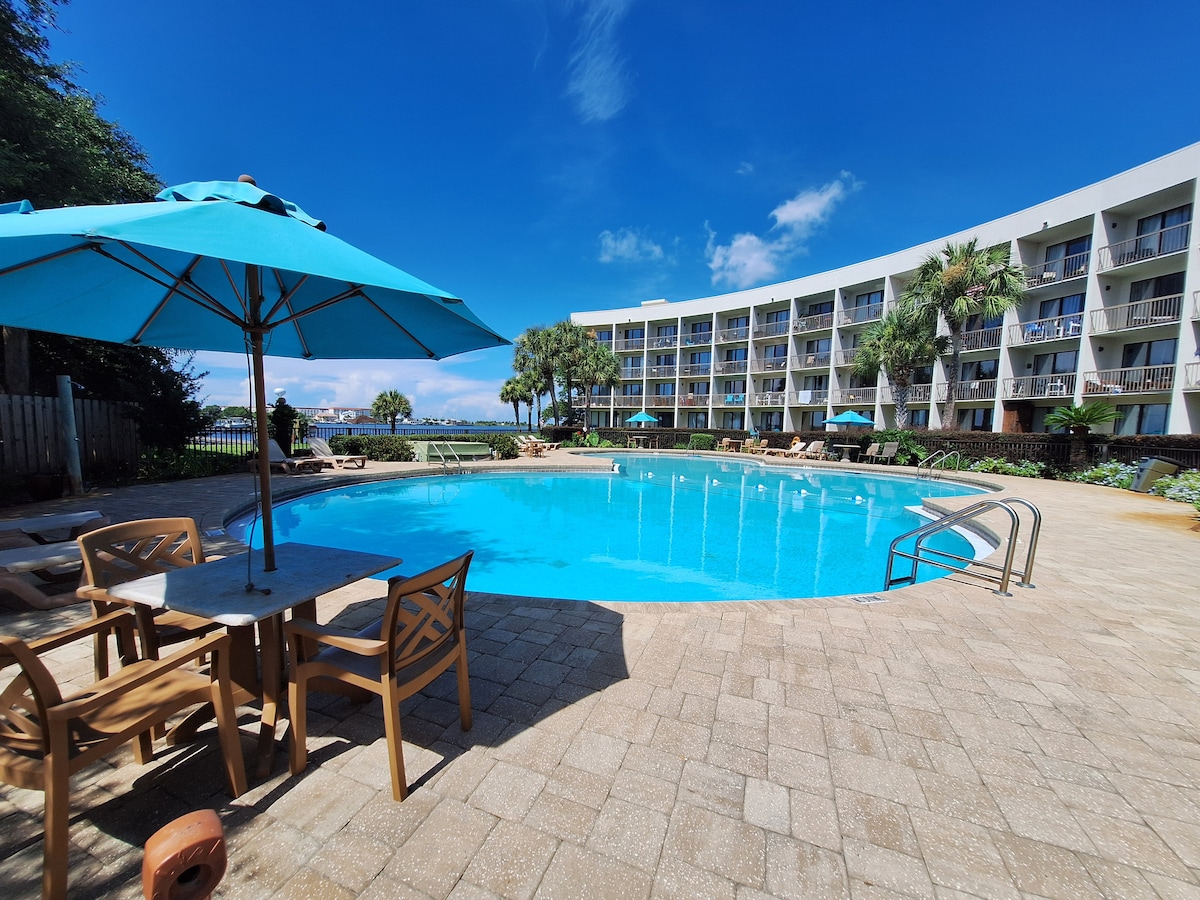Enjoy breathtaking views of the Santa Rosa Sound and marina from your private top-floor balcony in this waterfront studio. Whether you're sipping coffee at sunrise or watching vibrant sunsets each evening, this spot delivers unforgettable costal charm in a quiet, peaceful setting. Perfect for couples or solo travelers, the studio features a full bath with tile shower, well-equipped kitchenette and sparkling pool. Gulf beaches are a just a short drive away. Free parking and easy self check-in.