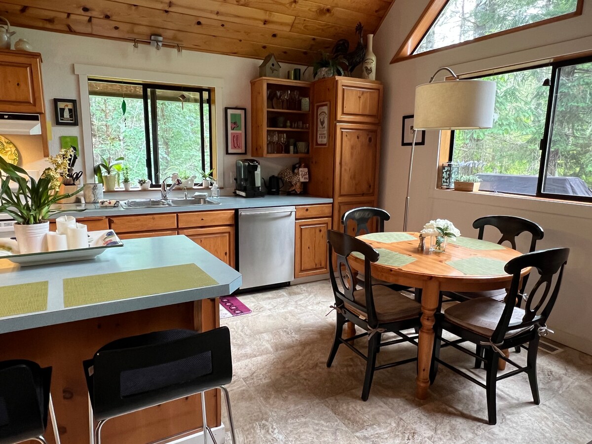 Welcome to my beautiful home and wooded property that's perfect for 1 to 4 guests on Harstine Island. Big kitchen, dining area, queen beds with cozy linens, full sized bathroom, towels, toiletries. Writing desks, books games, TV, WiFi. Relax with a view of the forest, birds and wildlife. Front and back decks with patio sets, hammock, umbrella. Walk in the woods or the two waterfront parks on the island. Basic breakfast, coffee, tea, snacks, some condiments and spices are provided.