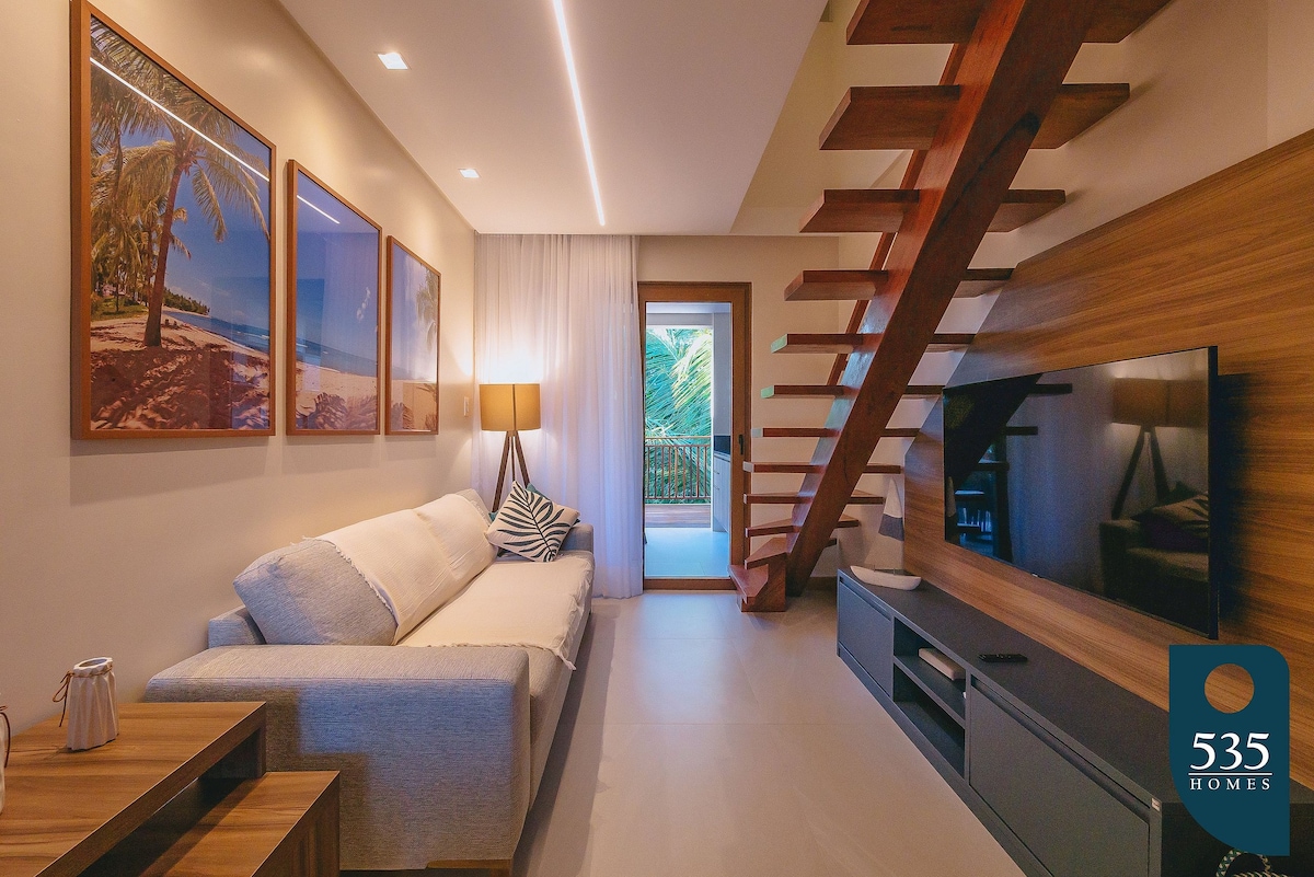 Nuevo, cómodo y completo 🏡 apartamento dúplex en el centro de la encantadora Vila de Praia do Forte, a 100 m de Praia do Portinho y junto al Proyecto Tamar, piscinas naturales, bares y restaurantes. Tiene una suite con cama queen, lavabo, cocina equipada, aire acondicionado en todas las habitaciones y sofá cama. ⚠️ Importante: 🚫🚗 Nuestra calle es peatonal (no se puede acceder en coche). 🅿️ Espacios que rotan la zona azul y el aparcamiento privado a 2-3 minutos a pie.