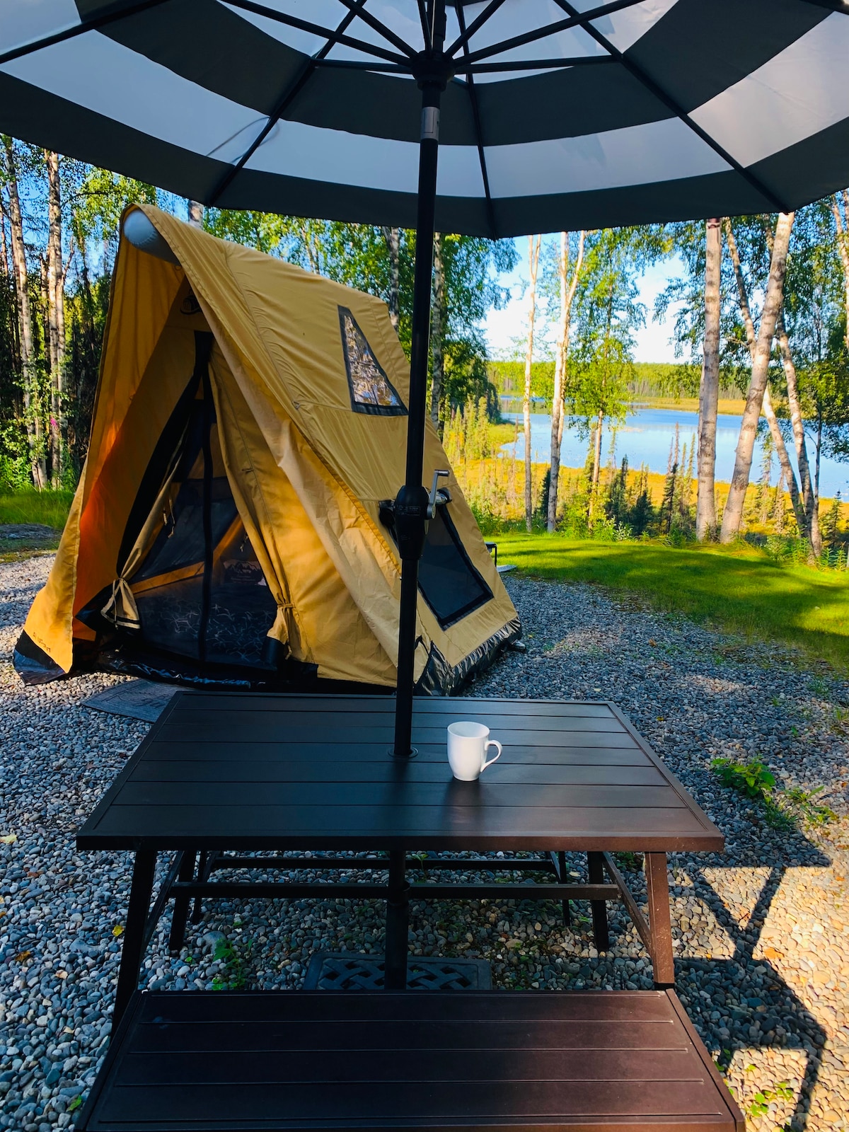 Vuelve a conectar con la naturaleza con esta escapada inolvidable. Ubicadas en la sección de prados de nuestra propiedad en el río Knik, nuestras tiendas glamping ofrecen una experiencia única. Desconecta, relájate y descansa en nuestras tiendas de campaña de lona. Cada tienda está elegantemente equipada con una cama tamaño queen, sábanas, alfombras, decoración elegante y otros servicios. A solo 45 minutos al norte de Anchorage, nuestra ubicación cuenta con vistas increíbles y acceso a todo tipo de actividades al aire libre. ¡También es perfecta para microbodas, retiros y pequeñas reuniones!