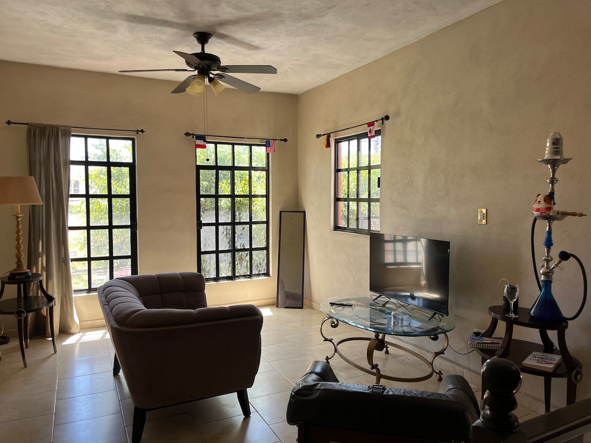 El departamento, con una agradable atmosfera, entrada de luz natural, perfecto para disfrutar o relajarte, cuenta con un sofá, una cocina integral con todo lo necesario, comedor, habitaciones con cama matrimonial, closet, ventilador, wi-fi, baño completo muy amplio y lo indispensable (shampoo, jabones, toallas limpias, papel sanitario, agua caliente) y un gran patio trasero, todo impecablemente limpio, además de cochera cerrada.