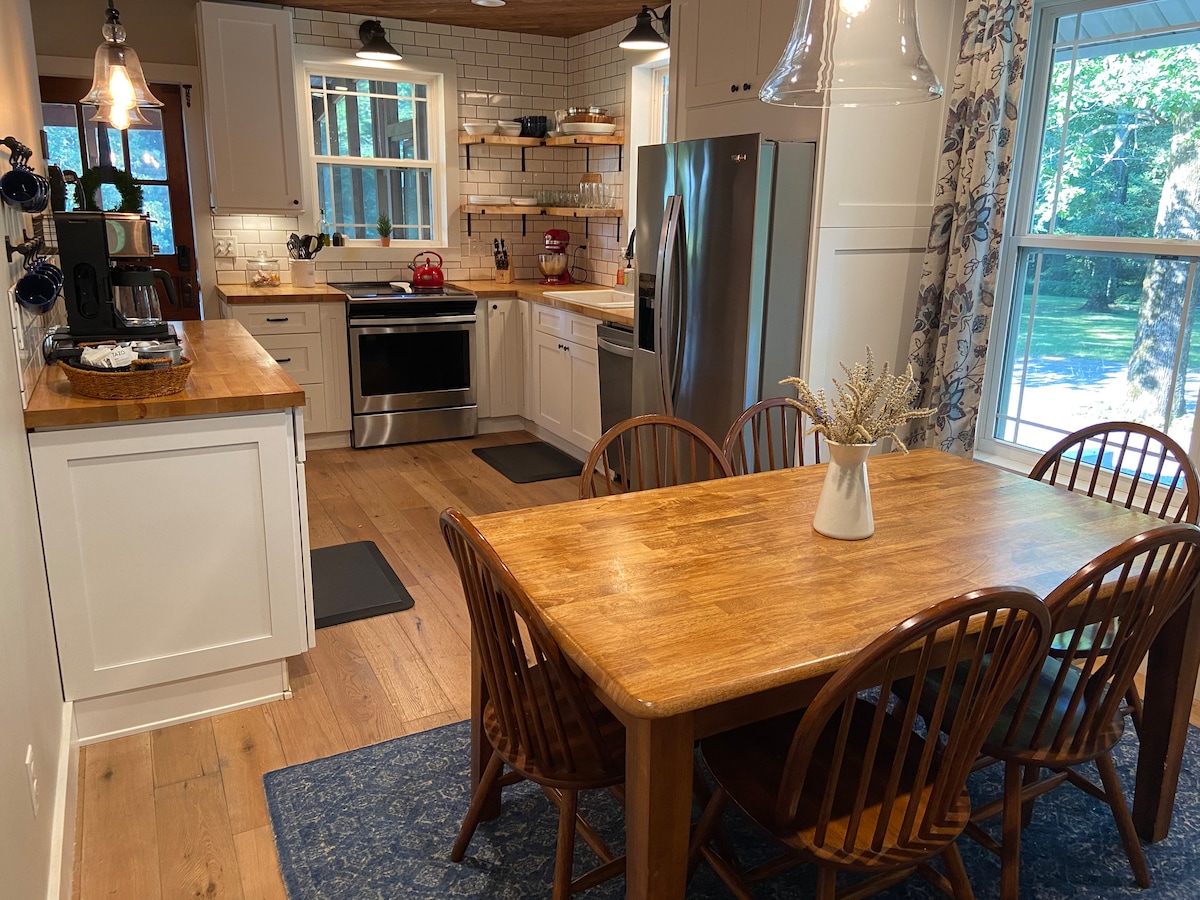 Desconecta de la rutina en este alojamiento único y relajante. Barndominio de nueva construcción escondido en un entorno arbolado en 3 lados. Observa la vida silvestre mientras desayunas. Situado a las afueras de la ciudad y cerca de todas las comodidades locales. Cuenta con una nueva cama tamaño king espaciosa, cocina completa con utensilios de cocina, TV grande de 50 pulgadas con wifi. Estufa de leña de gas para esas noches frescas y ambiente extra. Tiene una chimenea de gas al aire libre para que puedas sentarte en las mecedoras y ver las luciérnagas en verano.