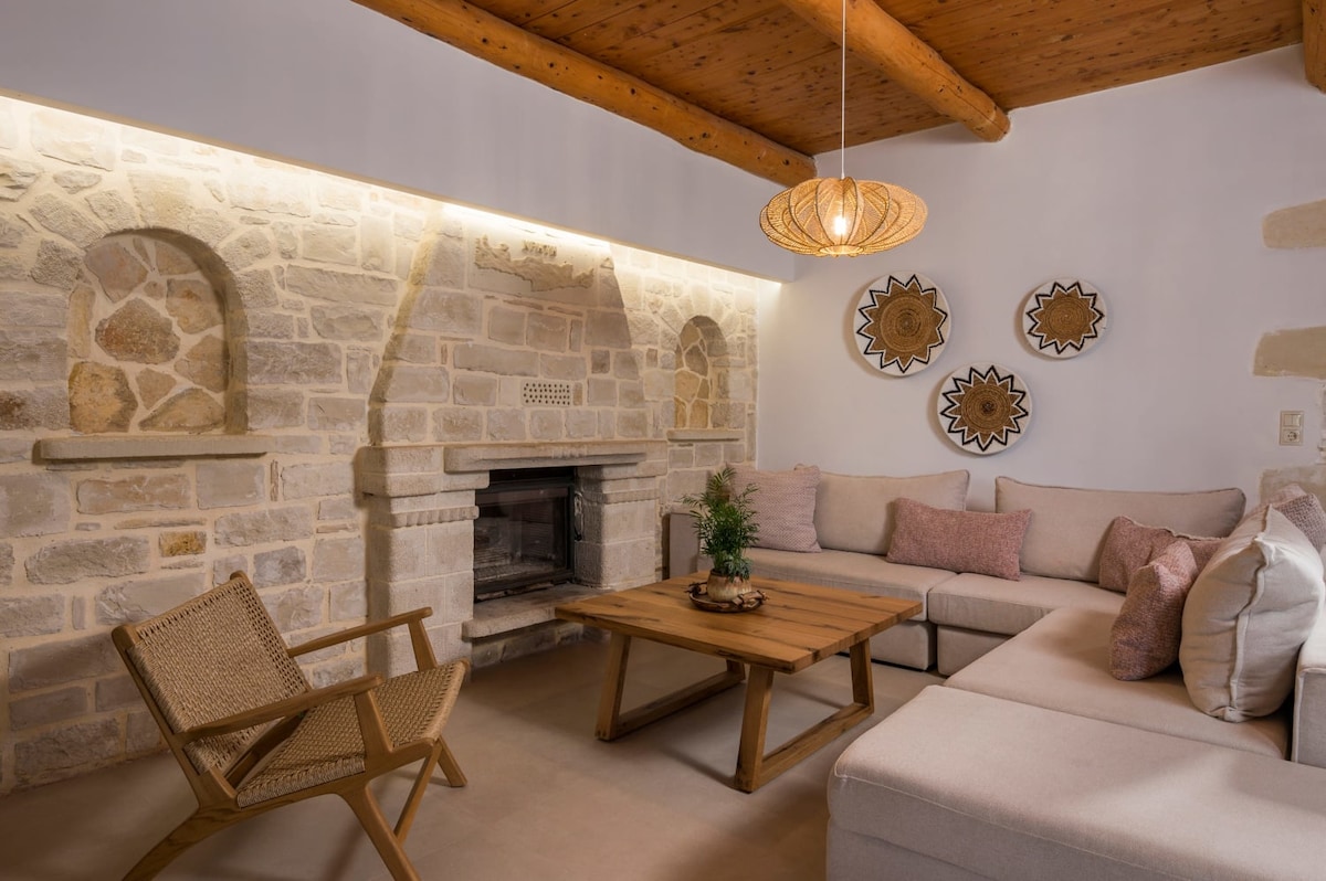 La casa de campo Asteri es una casa de campo de un dormitorio de planta abierta, joya y bellamente diseñada. Perfecta para parejas y recién casados. El interior de estilo boutique se abre a grandes terrazas para comer y relajarse. El baño con ducha conduce desde el relajante dormitorio a la piscina privada, que mide 2 m por 4 m. La piscina se puede climatizar previa solicitud. La casa de campo se encuentra entre olivos maduros en un acre de hermosa campiña cretense y está aislada de la casa principal.
