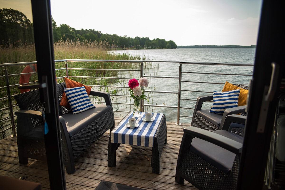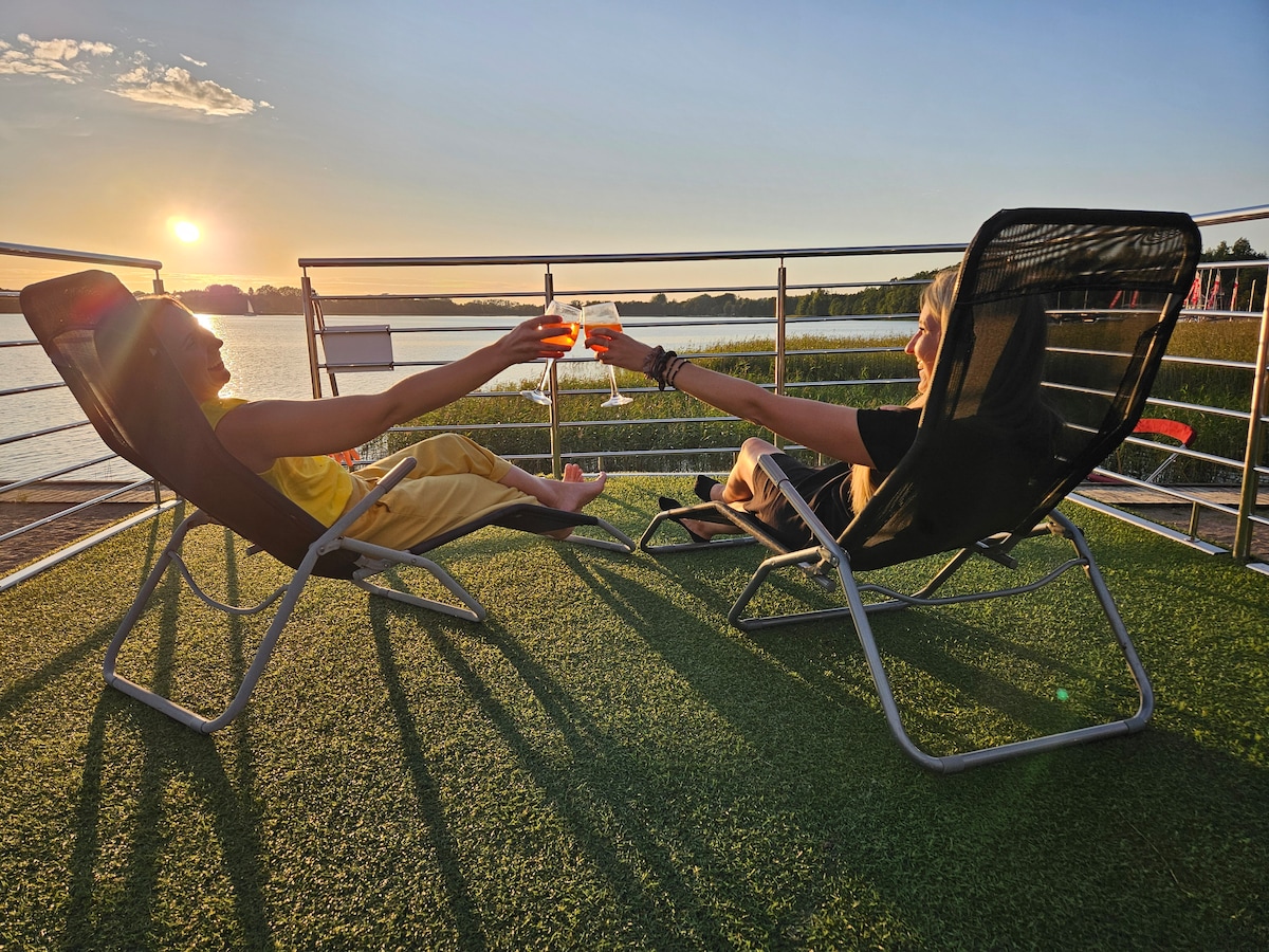 Domek na wodzie w kameralnej marinie to idealna ucieczka od zgiełku miasta. Gwarantuje fenomenalny widok na jezioro. Pomieści 6 osób: dwie przytulne sypialnie i salon z rozkładaną sofą. Na miejscu aneks kuchenny oraz łazienka z prysznicem. Największe atuty? Taras na dachu z leżakami i taras na parterze, skąd będziesz podziwiać oszałamiające zachody słońca. Domek wynajmujemy stacjonarnie, nie ma możliwości samodzielnego pływania domkiem.