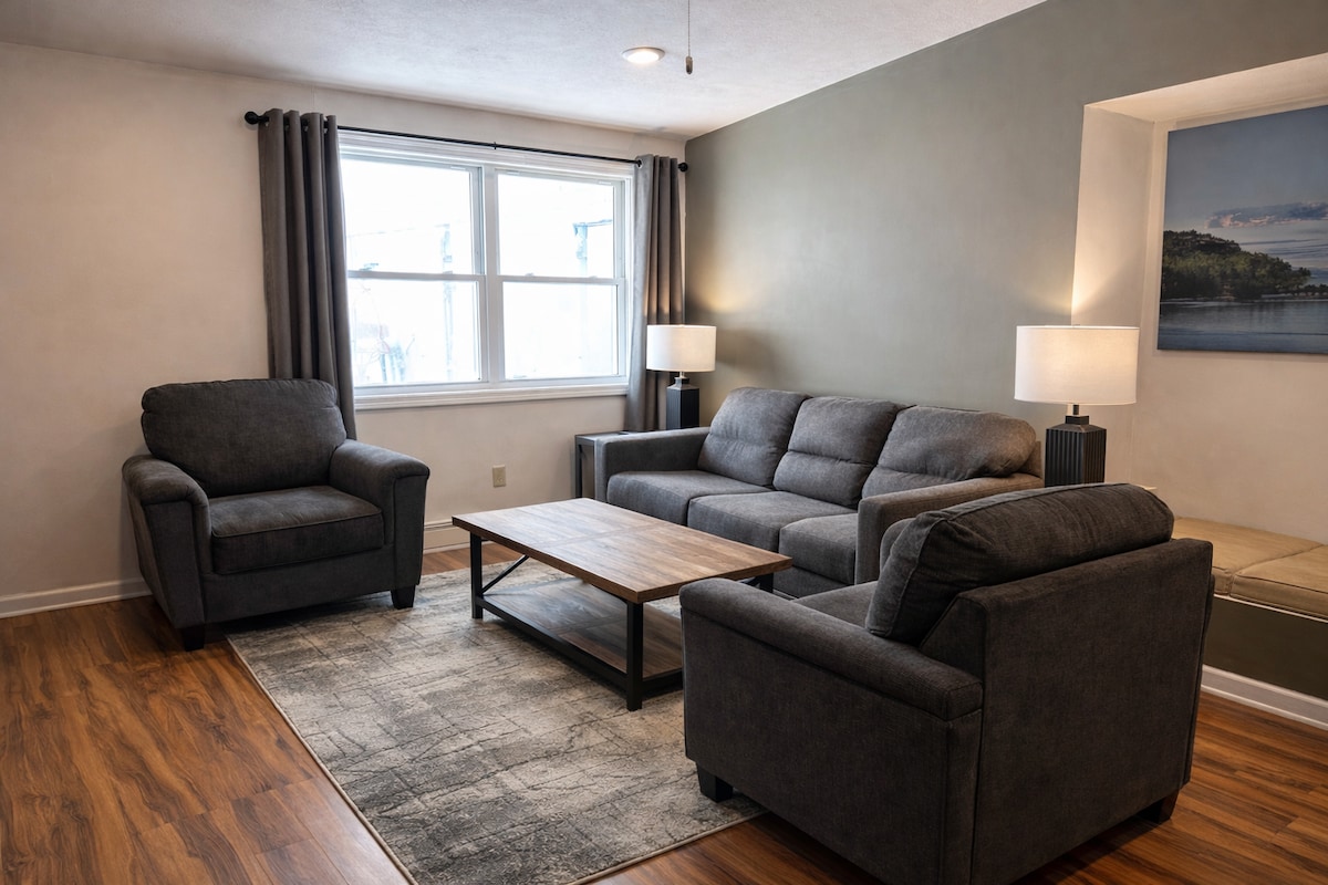 ¡Recién reformado, con dos dormitorios y un baño, ubicado en el corazón del centro de Munising! Este hermoso apartamento tiene vistas al puerto deportivo de la ciudad y a los cruceros de Pictured Rocks. ¡Estarás a pocos pasos de tiendas de regalos, restaurantes, bares, cafeterías y del parque Bayshore! En verano, Bayshore Park tiene mercados de agricultores los lunes y música en directo los martes. El parque es también donde se llevan a cabo todas las festividades del 4 de julio, ¡incluso se pueden ver los fuegos artificiales desde las ventanas de la sala de estar!