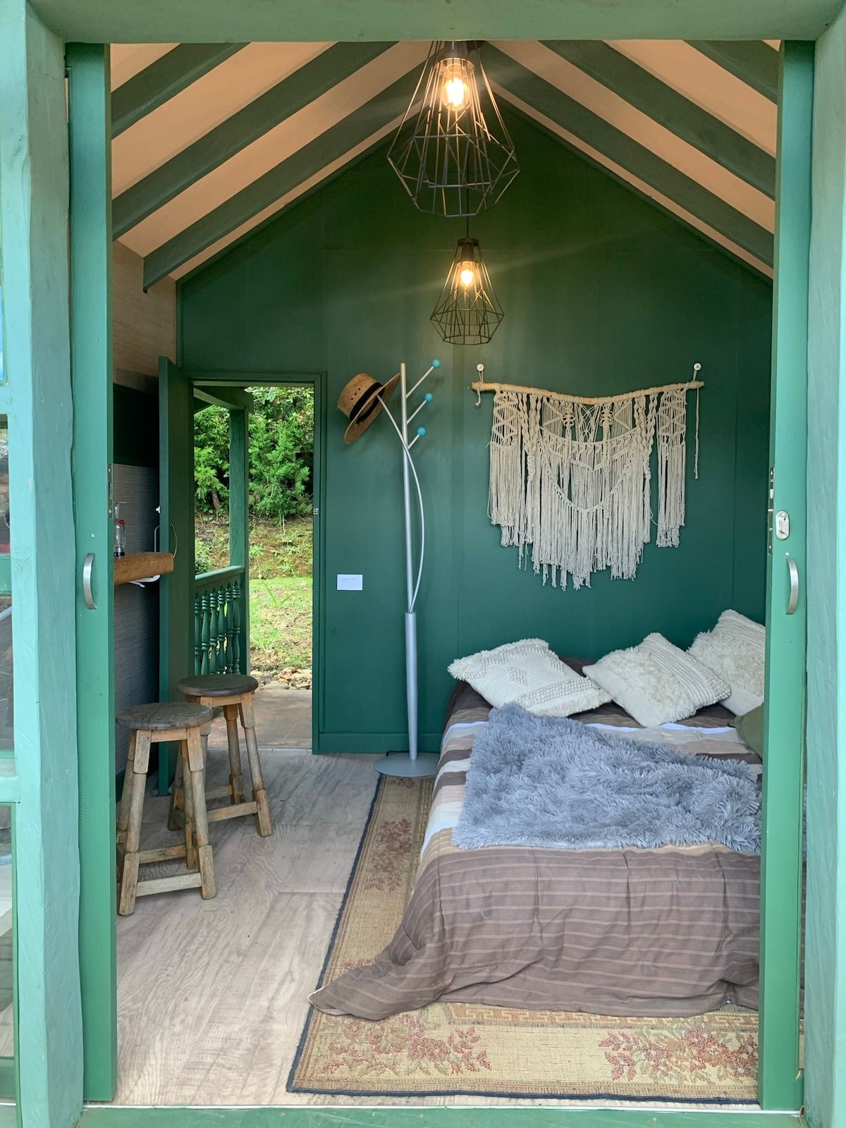 Rainforest Refuge Chalet in Guarne, Antioquia, Medellín, surrounded by majestic mountains and the soothing sounds of birds and butterflies. Enjoy breathtaking sunrises and reconnect with nature from our cozy cabin's spacious deck, where you can sip coffee and take in stunning views. Inside, a glass-ceiling bathroom invites you to unwind while the fully-equipped kitchenette enhances your stay. With outdoor furniture for al fresco dining and serene paths to explore, you’ll feel in heaven!