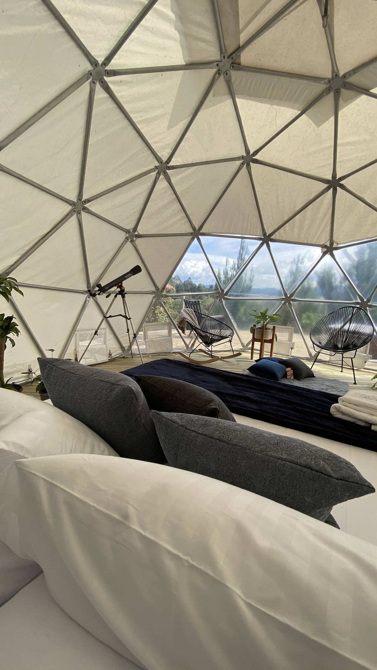 Glamping con Hermosa Vista Es un espacio de más de 900m2 solo para ti rodeado de naturaleza y arboles excelente ubicación A 40 min de la ciudad de Medellín 20 min del aeropuerto 50 min del peñol-guatape Completamente dotado Cafetera (cafe y aromatica incluida) Jacuzzi con agua caliente Baño privado Domo de 25 m2 Zona BBQ Fogata Ducha al aire libre Malla catamarán de 3x3m Parqueadero Contamos con un mayordomo las 24 horas horarios de check-in y check-out FLEXIBLES segun disponibilidad