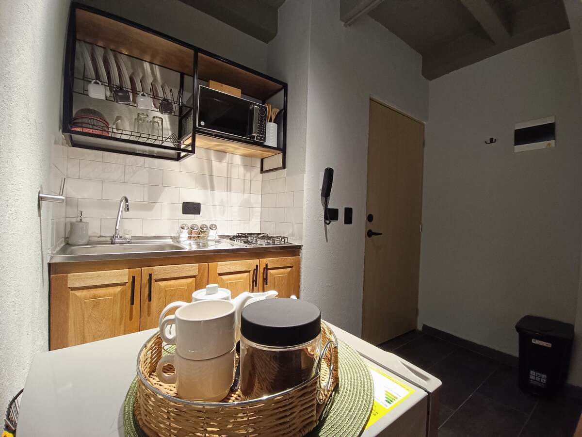 Suite completamente amoblada de 28 m2, con aire acondicionado y cocineta. Ubicada en una de las mejores zonas de Medellín, en un barrio muy tranquilo y cerca de todos los sitos de interés. La Suite cuenta con una vista espectacular a la ciudad y a las montañas. Podrás hacer uso de la zona de coworking, gimnasio y un espectacular café que ofrece diferentes tipos de bebidas a base del mejor café colombiano, podrás disfrutar de tu bebida en la terraza que se encuentran en el 2do piso del edificio.