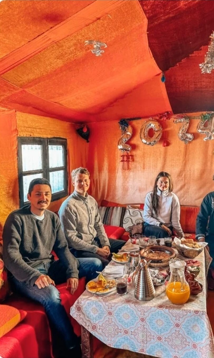 Volver a lo básico: vive la vida nómada Experimenta el verdadero estilo de vida nómada en nuestro campamento base en el desierto. Como anfitriones bereberes locales, compartiremos nuestras tradiciones y nuestra forma de vida. Disfruta de un desayuno tradicional bereber y podemos organizar el almuerzo o la cena bajo petición. Después de la puesta de sol, reúnete alrededor de la fogata para disfrutar de música en vivo bajo las estrellas. ¿Quieres montar en camello, hacer sandboard o quad? Solo tienes que decírnoslo y lo haremos realidad. ¡Esperamos recibirte!