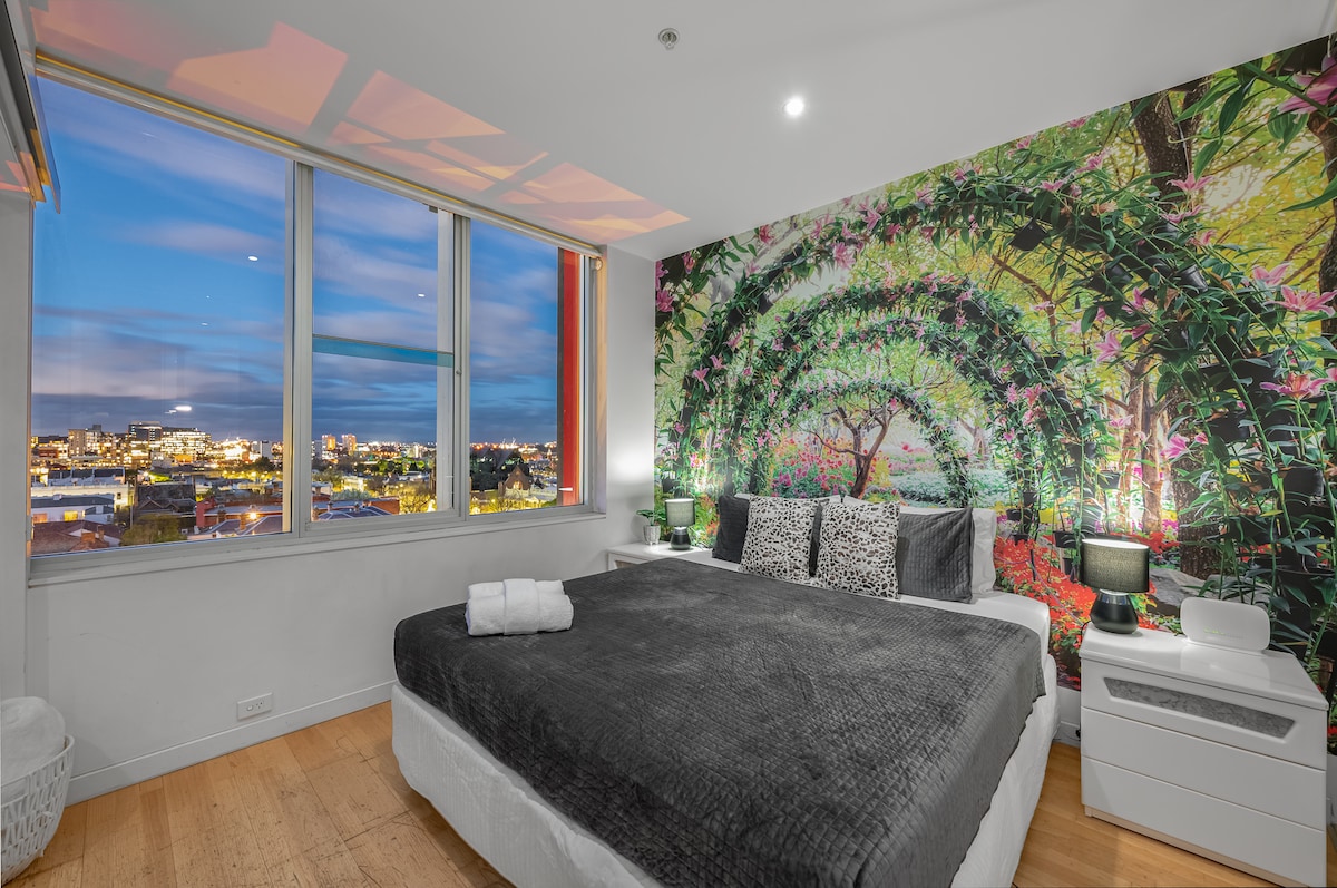 Piérdete en tu propio jardín privado del Edén y duerme en una cama llena de luces centelleantes. A medida que sale el sol, puedes preparar tu café y alójate por las ventanas abiertas mientras los globos aerostáticos se navegan. Situado en el 8vo piso, escondido en el bolsillo más próspero de Melbourne, a las puertas del CBD, hay un montón de buenos tucker a un tiro de piedra. Este pequeño faro ofrece una mezcla de cultura australiana justo al lado de los estadios deportivos y atracciones turísticas más emblemáticos de Australia.