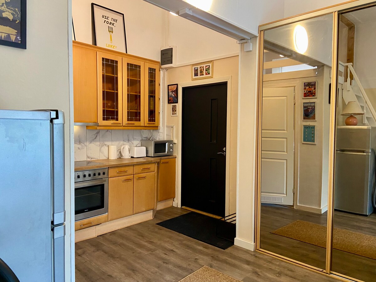 Apartamento con sauna cerca del centro de la ciudad. A 10 minutos a pie de la plaza del ayuntamiento. A 5 minutos de la estación de tren. El departamento cuenta con sala de estar con chimenea y cocina, 1 dormitorio y baño con ducha y sauna pequeña. El departamento está en el primer piso y tiene entrada privada. En la cocina encontrarás una cocina, una pequeña nevera, equipo de cocina básico y vajilla.