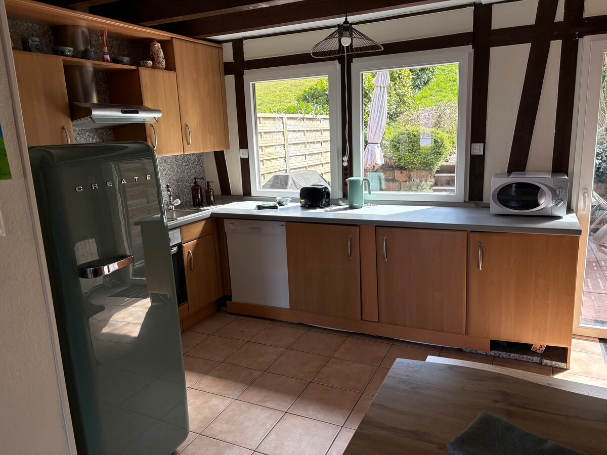 En un pequeño pueblo alsaciano típico del Parque Nacional de los Vosgos del Norte, 2 habitaciones de 30 m2 tranquilas. Entrada independiente. Aparcamiento. No hay comercios en el pueblo. El supermercado más cercano se encuentra a 5 km, así como las panaderías. Cocina equipada abierta al salón con televisión y wifi. Dormitorio con cama de 140 cm, separado por una cortina de la sala de estar. Cuarto de baño con placa de ducha. Zona verde con zona de relax, tumbona y barbacoa. Se admiten animales domésticos.