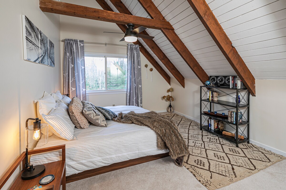 Nos encanta hacer que nuestro lugar se sienta más acogedor para tu escapada perfecta y ¡no podemos esperar para hospedarte! Nuestra cabaña es una casa de huéspedes independiente situada en nuestra propiedad de 4 acres. Lejos de la casa principal, ofrece una amplia privacidad. Se puede llegar al dormitorio del loft (no apto para niños) a través de una escalera fácil de subir. La cama KING SIZE garantiza una noche de descanso y es perfecta para una mañana de descanso. Las características incluyen una cocina pequeña, chimenea eléctrica, parrilla, fogata al aire libre (con madera), patio cubierto y un televisor inteligente.