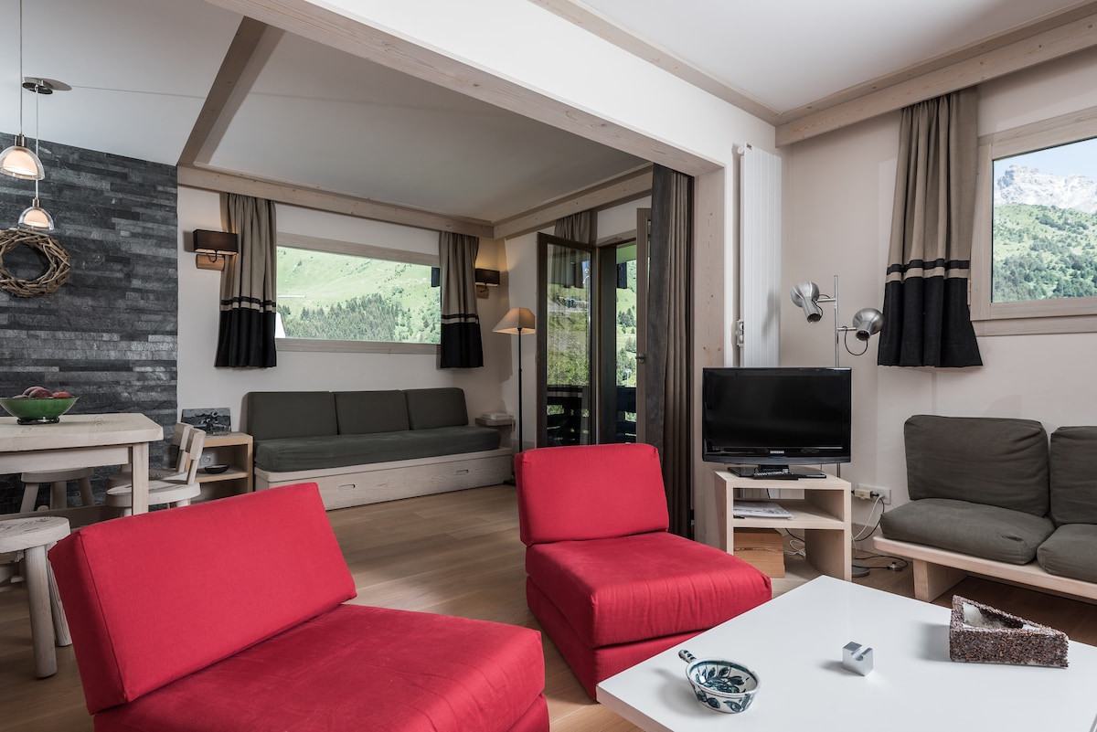 Appartement aux pieds des pistes résidence à Meribel Mottaret accès direct aux pistes des 3 vallées courchevel val Thorens Proche tous commerces Balcon sud Avec son coin montagne séparé par deux portes couloir, l'appartement peut accueillir confortablement 4 personnes : couchage privatisé 1 lit mezzanine 2 pers coin montagne 1 lit d appoint 1 pers coin montagne 1 lit canapé convertible cote séjour Parking gratuit Navette gratuite pour Meribel centre draps serviettes ménage compris