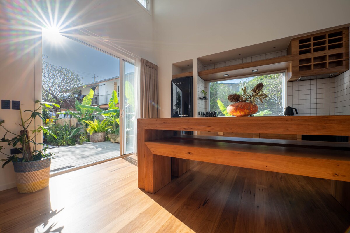 Tu alojamiento independiente tipo estudio se encuentra en la parte trasera de la propiedad con su propia entrada privada con cerradura. Está renovado con un baño moderno y una minicocina con todo lo necesario para tu estancia. La cama tamaño king tiene capacidad para una pareja o se puede dividir para dos personas. Té/café, toallas y otros pequeños artículos esenciales incluidos. La residencia principal es una casa de playa original restaurada de 1960. La propiedad privada cerrada está a pocos pasos de playas de surf vigiladas y de las tiendas de Nobby Beach.