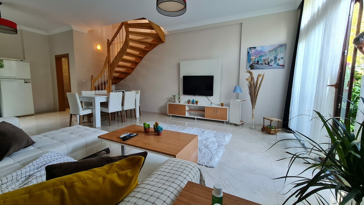 Puedes relajarte en familia en este tranquilo alojamiento, que se considera frente a la playa en la ubicación más hermosa de la región. Tenemos un restaurante y un sendero para caminar en la playa. TV, refrigerador, lavadora, lavavajillas, horno, plancha y todos los suministros de cocina están disponibles. Wifi disponible. No se hacen reservaciones, excepto para la familia y las parejas. En este anuncio, como en las fotos, se dará el piso dúplex superior de la casa, los pisos superior e inferior son apartamentos independientes con diferentes entradas. La piscina se utiliza en forma de dos círculos.