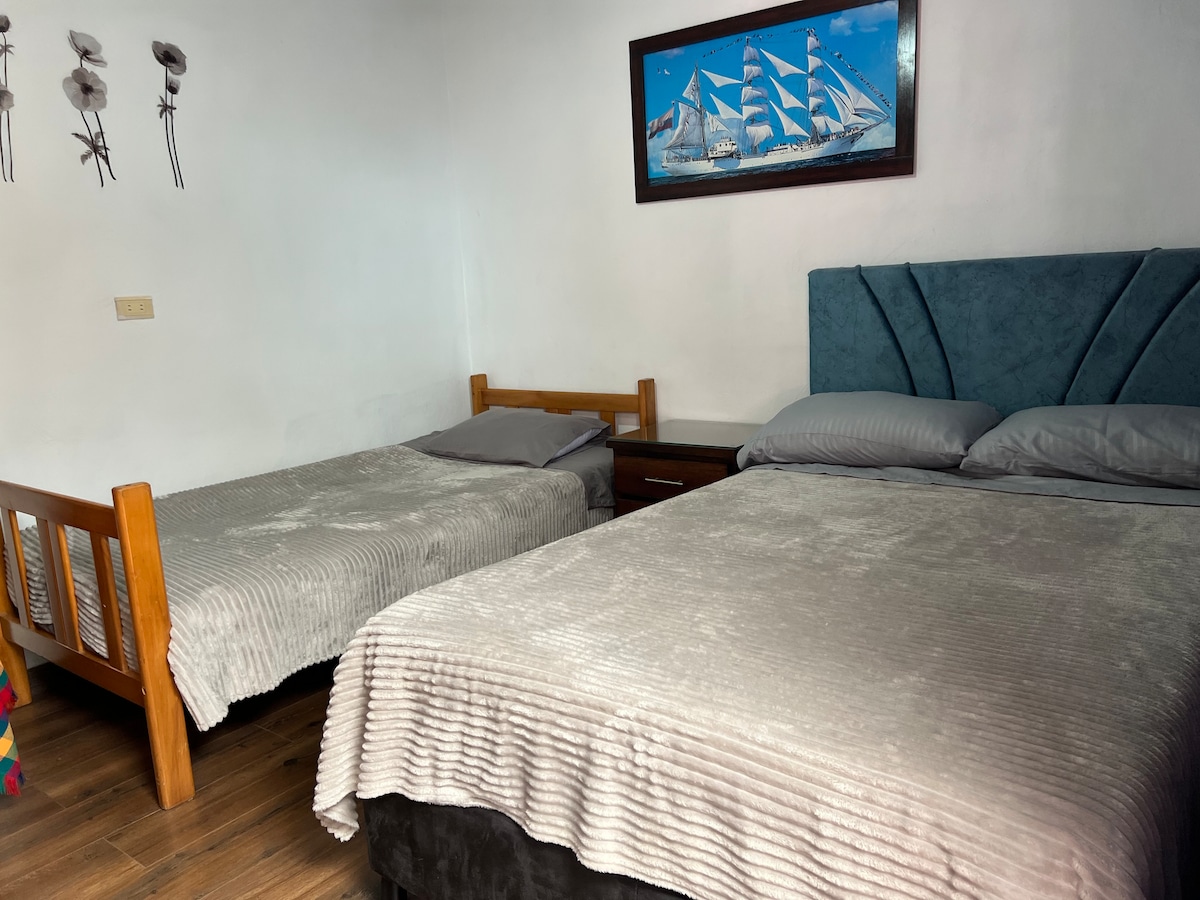 Este acogedor apartaestudio es de uso exclusivo, independiente y privado consta de una habitación amplia, con una cama doble, TV, clóset y mesa de escritorio, baño con agua caliente y una cocineta con nevera la cual tiene lo necesario para cocinar como ollas, loza, cubiertos y otros adicionales. El apartaestudio se encuentra ubicado en la parte de atras de la casa principal, por lo que la entrada es compartida entre ambos. El apartaestudio tiene una buena iluminación, es muy limpio y acogedor