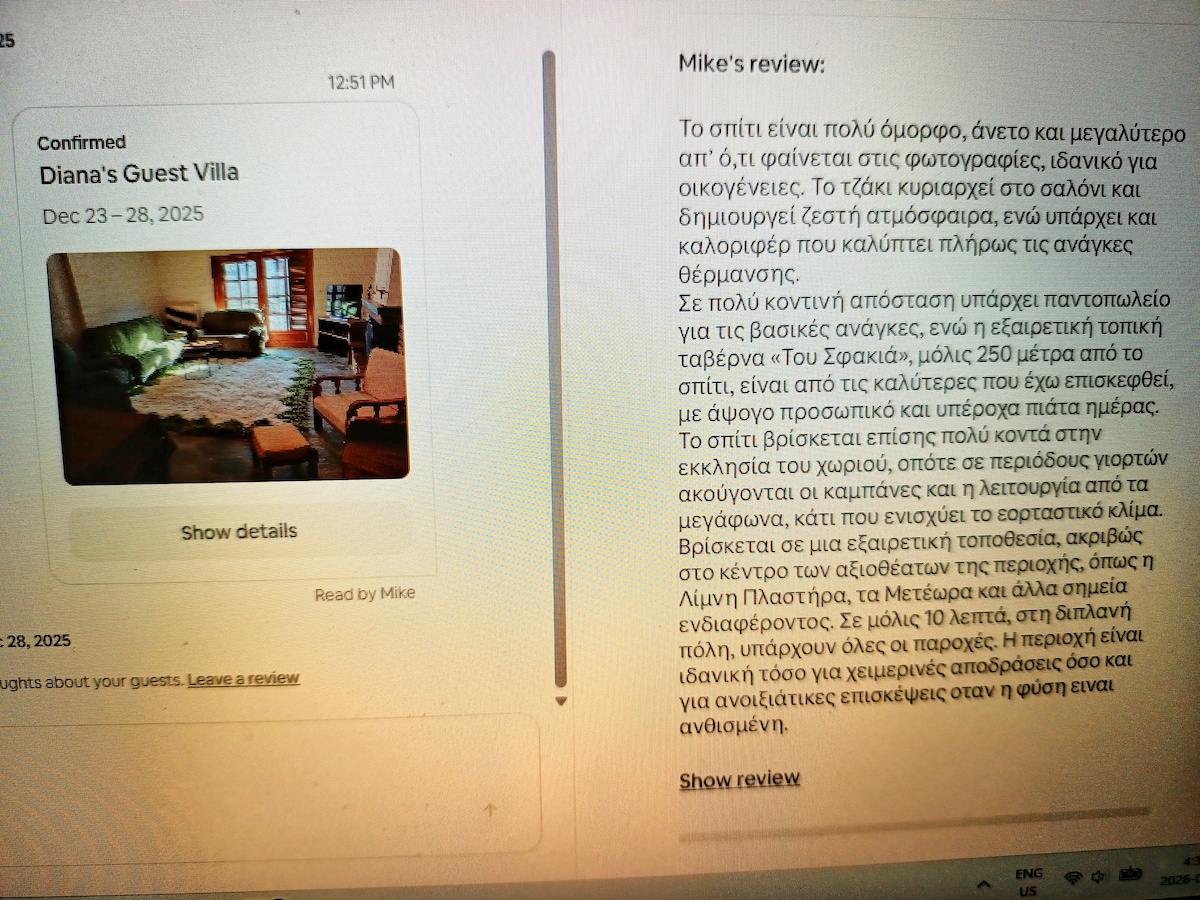 Esta casa es nueva con una decoración moderna. Puedes disfrutar de la vista ilimitada de las gigantescas rocas de Meteora. En el interior de la casa hay calefacción subterránea, siempre hace calor en los inviernos y fresco en Summers. También tiene ventanas eléctricas y dispositivos eléctricos. Cerca de la espaciosa sala hay una gran chimenea. Además, hay 2 dormitorios grandes y 2 baños. La distancia del centro de Kalabaka es de solo 5'de largo. Ven a llenar tus maletas con recuerdos y experiencias de nuestro lugar santo.