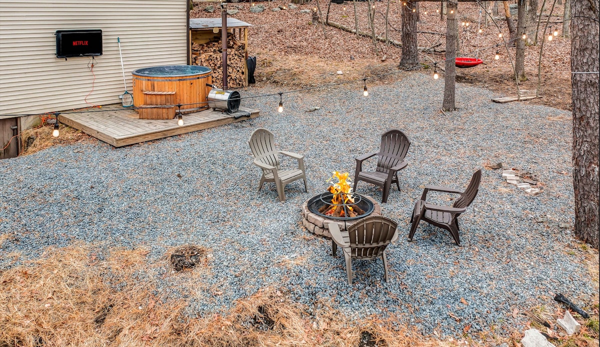 ¡Verdadera escapada a la naturaleza con un jacuzzi de leña, TV al aire libre, chimenea y todos los elementos esenciales que necesitas para tu escapada! Wifi de alta velocidad, por lo que es el espacio perfecto para trabajar desde casa. Excelente ubicación, a solo 10 minutos en auto de Shawnee Mountain y Bushkill Falls. La cabaña es adecuada para 8 personas con 3 dormitorios. Plano de planta abierto que conecta la cocina, el comedor y el espacio de estar resaltados por una hermosa chimenea. ¡Relájate con las impresionantes vistas de la naturaleza más cercana!
