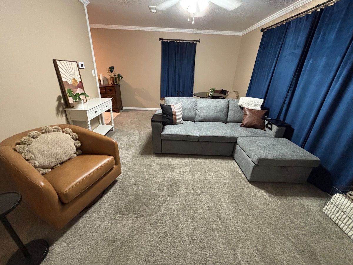 Casa bonita y cómoda en un barrio tranquilo. Convenientemente ubicado con fácil acceso al centro de la ciudad y otros servicios de la ciudad. Esta casa es perfecta para aquellos que viajan con mascotas, incluidos los que prueban en el centro canino TNT. Hay un patio trasero privado vallado que incluye una pista de grava separada y equipo de agilidad para practicar. El espacio tiene dos dormitorios, uno con cama tamaño queen y otro con cama de matrimonio. Un baño con ducha y bañera. Mantente conectado con wifi gratuito y televisión Roku.