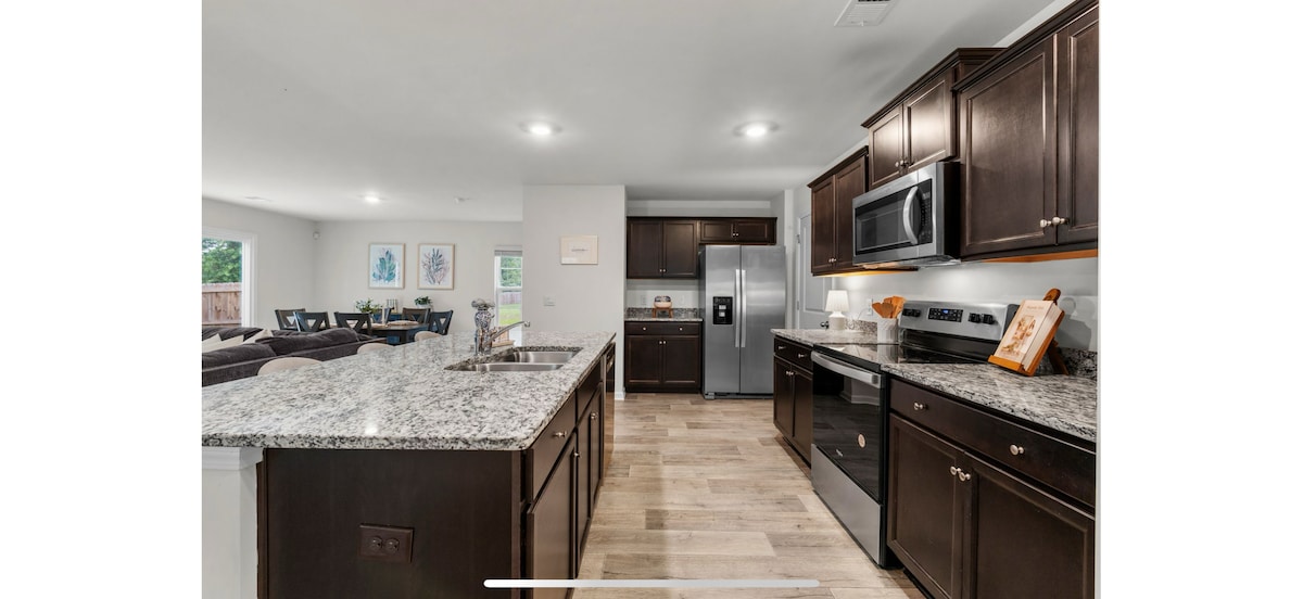 Relájate y desconecta en este alojamiento tranquilo y elegante. Construida en 2023, esta casa cuenta con tres cómodas habitaciones (2 camas tamaño queen/1 cama completa) con servicios increíbles, que incluyen electrodomésticos nuevos, internet inalámbrico, una cocina completa equipada con utensilios de cocina, una chimenea relajante, un patio trasero privado y mucho más. Ubicado a solo 1 minuto de Hunter-Gatherer Brewery, a 2 minutos del aeropuerto de Owens Field, a 5 minutos del estadio de fútbol de la USC y a 6 minutos del Colonial Life Arena, ¡te garantizamos que disfrutarás de tu estancia!