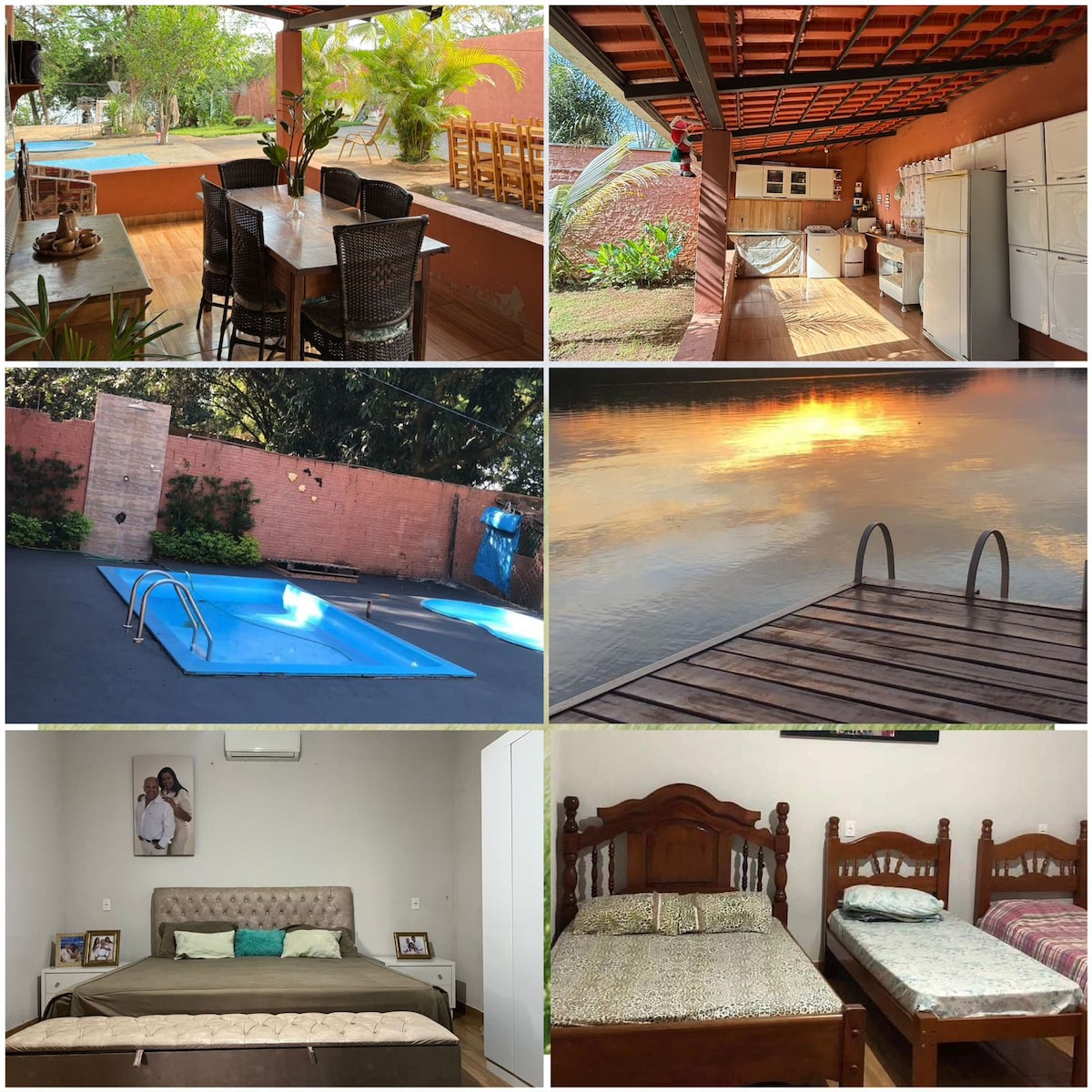 Relájate con toda la familia en este alojamiento tranquilo. Ven a disfrutar de una maravillosa puesta de sol, días tranquilos y agradables en el rancho Recanto das Águas. Ubicado en Miguelópolis, en la presa del Río Grande, en el condominio cerrado Pontal do Rio Grande. 14 personas en tres dormitorios que son suites, con aire acondicionado y wifi, presentes en la casa principal. Una piscina maravillosa para reunir a amigos y familiares. Tiene una zona al aire libre con cocina y barbacoa, cerca del astillero.